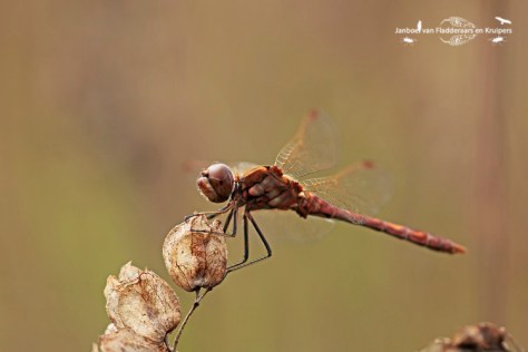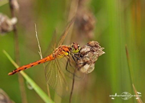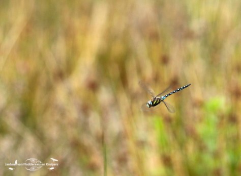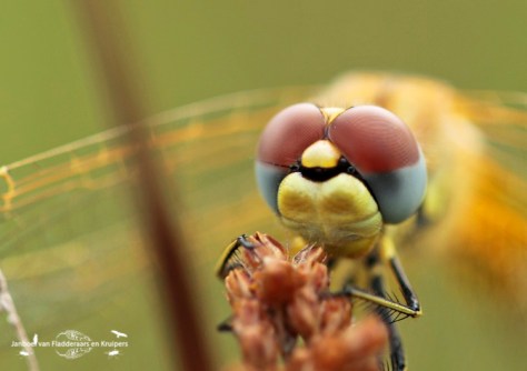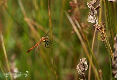 Na dit ommetje zijn we teruggegaan naar de Schammer, waarop we vroegen aan de reeds gearriveerde libellenzoekers of ze de Kempense al gezien hadden. “Nee, helaas niet,” was het antwoord. “Hij is vanochtend wel één keer gemeld, maar ik heb hem nog niet gevonden.” Tja, die melding was dus van mij…. Terwijl wij een andere hoek ingestuurd werden voor de zwervende heidelibel, ging de andere man weer zoeken op de plek waar ik de Kempense gezien had. Ik had gelijk beet met mijn zwervende. In deze hoek vlogen er wel een stuk of acht, stuk voor stuk hartstikke vers! Een leuk beestje, met zijn mooie grijsblauwe ogen. De Kempense heidelibel werd niet meer gevonden. Kylian en ik vonden het mooi geweest, en gingen zeer tevreden naar huis!