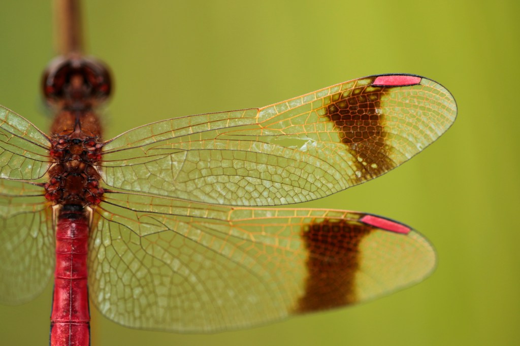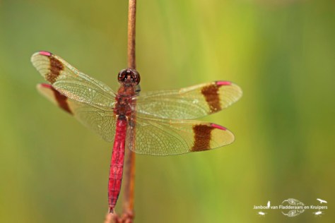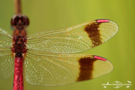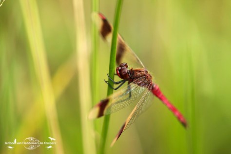 We besloten door te fietsen naar Landgoed de Emelaar, net aan de andere kant van Stoutenburg. Hier had ik vorig jaar al bandheidelibellen gezien, en ik wilde nu met een nieuwe camera nog wel eens kijken! Het vinden was niet moeilijk, het waren er best veel! De foto’s gingen eerst moeizaam, ze vlogen steeds op, maar uiteindelijk is dat ook zeer goed gelukt!