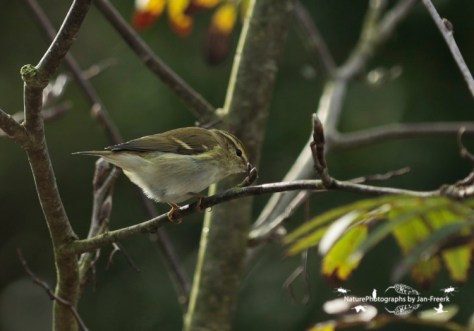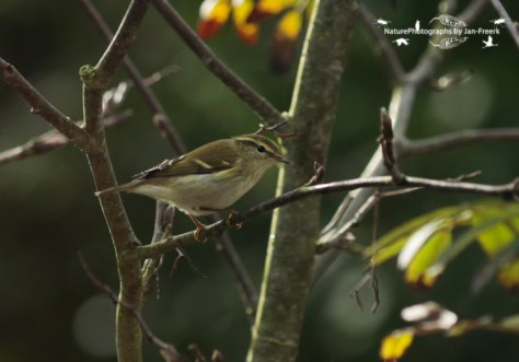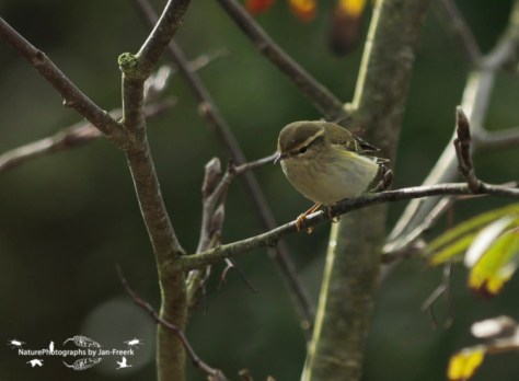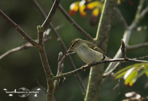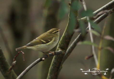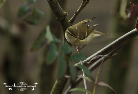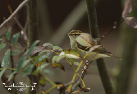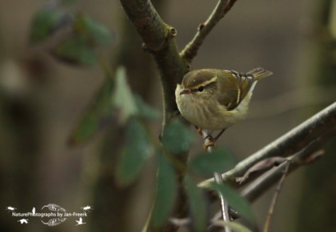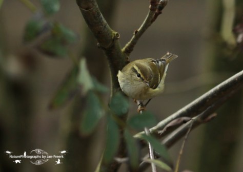 Vanochtend tijdens het ontbijt werd ik plotseling opgeschrikt door een heel klein vogeltje in de tuin. Formaatje tjiftjaf, maar het klopte niet. Hij viel me onmiddellijk op door het zeer duidelijke oogstreepje, en het iets te forse formaat. Al heel snel zag ik de dwarsstreepjes op de vleugels en wist ik dat het raak was. Ik had mijn eerste bladkoning te pakken!