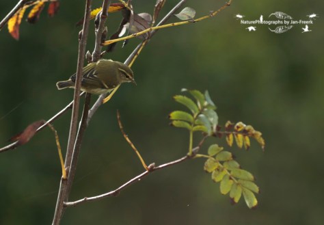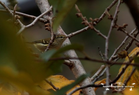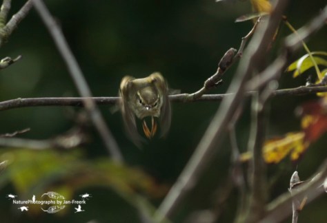 De bladkoning zat hoog in de lijsterbes. Ik haalde snel mijn camera, maakte wat foto’s en rende daarna naar boven, om op gelijke hoogte met het vogeltje te komen. Doordat de boom vlakbij huis stond was dat prima te doen met mijn macrolens. Hij liet zich prachtig zien! Na zo’n twee minuten was hij weg, maar ik had hem al gemeld in de appgroep voor zeldzaamheden in Wageningen en omgeving. Vijf minuten later zat de bladkoning opeens wéér in de lijsterbes. Ik rende weer naar boven, en had nu nog veel mooiere foto’s! Wat een prachtig showbeest! Nadat hij ook nu weer wegvloog naar de buren, dacht ik dat hij nu écht weg zou zijn. Maar nee, drie minuten later zat hij weer vóór het huis. Daar bleef hij ook wel vrij lang hangen, maar helaas zaten er veel bladeren, waardoor hij moeilijk te zien en te fotograferen was. Na een tijdje ging hij er weer vandoor, en ging nu ook écht vrij ver weg. Iemand die op de melding van mij was afgekomen keek net twee minuten te laat in het struikje voor ons huis. De vogel was gevlogen.