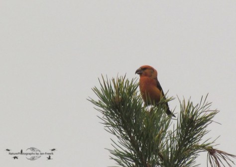 Na deze klapper besloten we om toch maar naar de andere kant van de Heuvelrug te fietsen, in de hoop dat we de grote kruisbekken daar beter zouden zien. Er waren daar wel al goede foto’s gemaakt die ochtend! We kwamen daar echter niet aan. Ergens halverwege stopten we even om over de heide te kijken of we nog een leuke vogel konden betrappen. En toen werd het alweer spectaculair! Midden op de heide zaten twee beflijsters. Terwijl we daar naar zaten te kijken kwamen er twee vinkachtigen aanvliegen. Maar ze waren te groot. Het volgende moment zaten we te kijken naar een mannetje en een vrouwtje grote kruisbek, in de top van een vrijstaande den op de heide, zo’n 25 meter voor ons! En daar bleven ze ook wel even zitten! Lang genoeg om mijn moeder op te bellen die voor ons uit de berg op fietste en daarna weer naar beneden kwam rollen om de twee zeldzaamheden nog te zien! Ook hoorden we in de verte nog meer grote kruisbekken, en we hoopten dat die ook deze kant op zouden komen. Helaas deden ze dat niet, maar vlogen de twee voor onze neus in die richting en waren ze kwijt. Maar wat waren ze prachtig! Met die forse snavel en kop, in vergelijking met de rest van de vogel. En dus een flinke maat groter dan een gewone kruisbek.