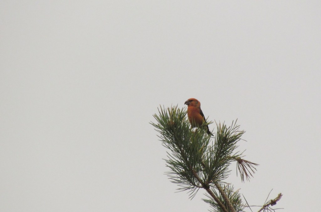 Daarna liepen we verder het bos in. Na een tijdje werd ik door Corné geappt dat er aan de andere kant van het gebied grote kruisbekken gezien waren, dus wilde ik daarheen fietsen. We treuzelden echter een beetje, waardoor we nét genoeg tijd rekten om een groepje kruisbekken over te horen komen. Eerder hoorden we al gewone kruisbekken, maar dit geluid was harder, íets hoger en scheller, en net wat meer tju-uup in plaats van tju-duup. Zo konden we ons die fietstocht van 10 kilometer wel besparen, want hier zat ook een groepje!! En nog leuker, nu hadden we hem niet getwitcht maar zelf ontdekt! Het zien was echter nog een stuk lastiger. Af en toe zag je een vogel overvliegen, ter grote van een appelvink die het geluid van een grote kruisbek maakte. In totaal zag ik er zeker 5 tegelijk overvliegen, maar door de bomen heen waardoor ik er makkelijk eentje gemist kon hebben. Luister hier het geluid, en zet je geluid hard, want het is een duidelijke opname, maar gemaakt met mijn telefoon waardoor het niet heel hard is.