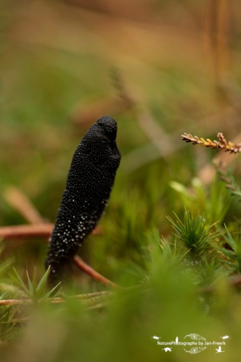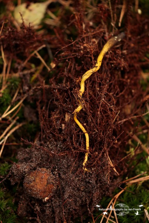 Intussen vonden we op de grond een aantal knotszwammen. De zwarte truffelknotszwam! In het boek lazen we dat hij parasiteert op hertentruffels, dus besloten we even te graven om te kijken of we zo’n hertentruffel konden vinden! En ja hoor, net onder het mos zat in de grond een korrelige hertentruffel verstopt!