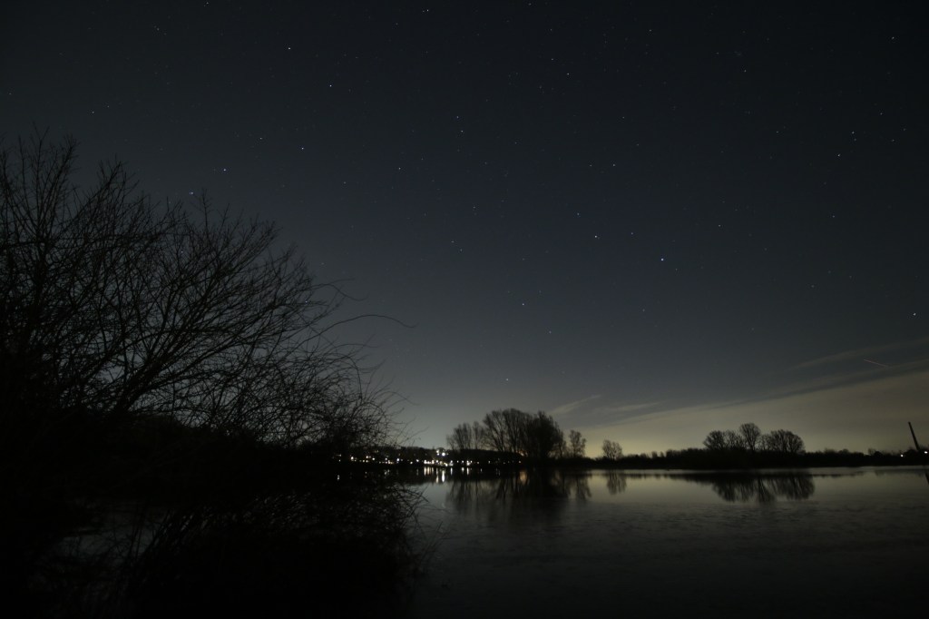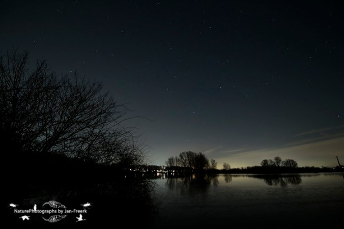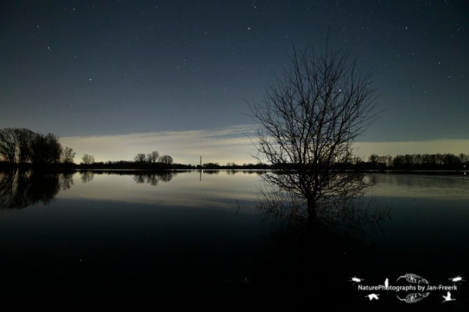 De ondergelopen uiterwaarden met onder andere Orion en de Stier erboven