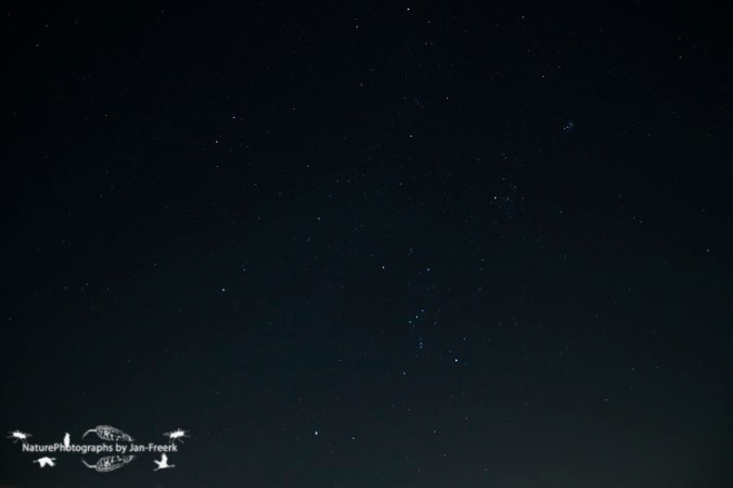 Alleen maar sterren. Orion, Stier, Pleiaden, Tweeling en Sirius zijn op deze foto te zien.