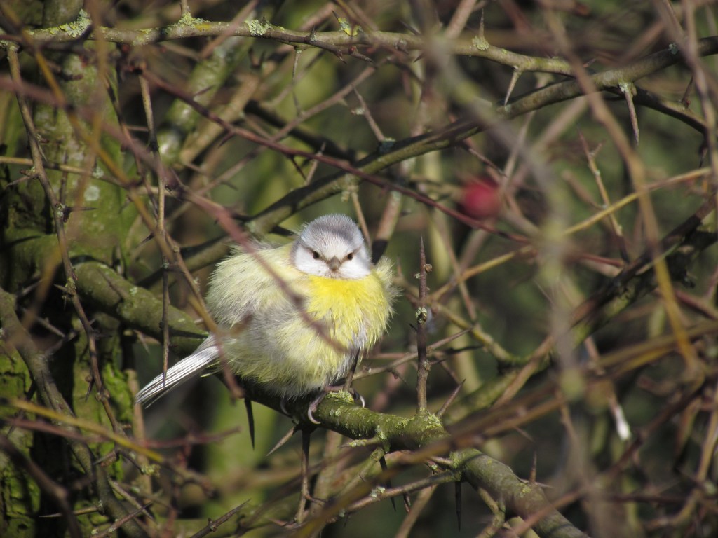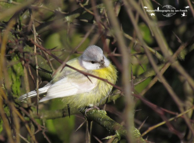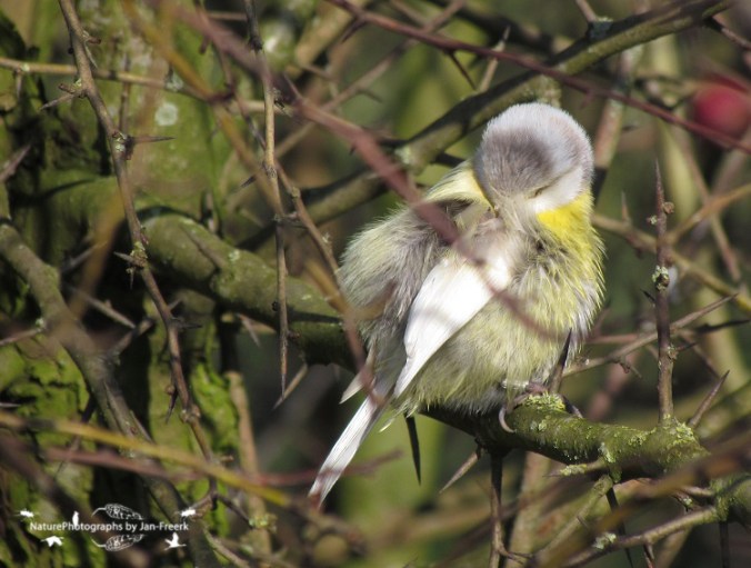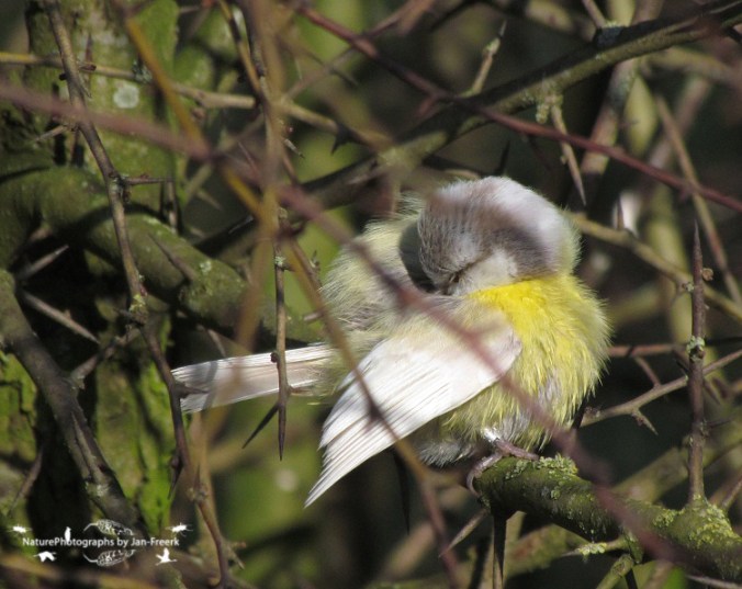 Terwijl ik vanmiddag door het Binnenveld naar huis fietste ontdekte ik in de struiken een opvallend pimpelmeesje. Tussen de gewone pimpelmezen zat een grotendeels albino (leucistische). Al poetsend liet hij zich prachtig zien! Bij kraaien, kauwen en merels heb ik het wel vaker gezien, maar bij mezen nog niet. Ik ben benieuwd of iemand dat wel eens gezien heeft, dus laat het weten in de reacties!