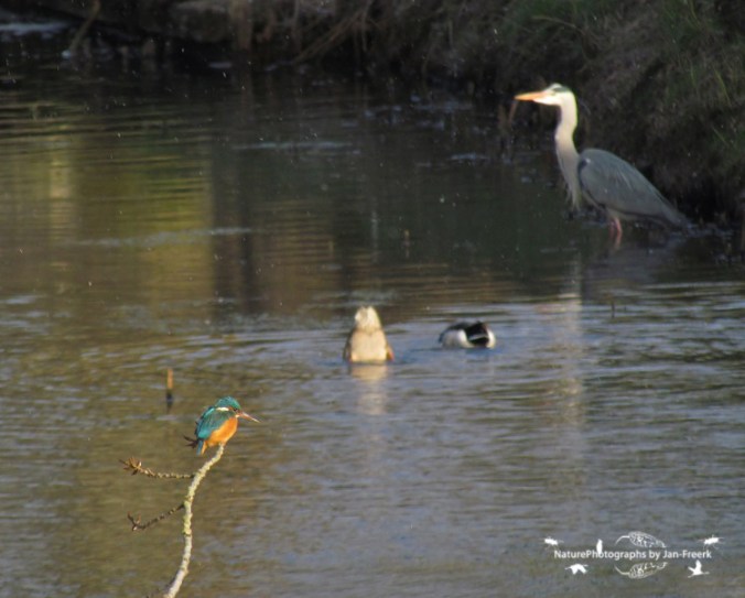 IJsvogel, twee wilde eenden en een blauwe reiger
