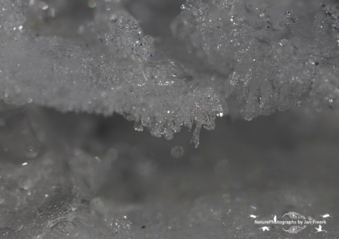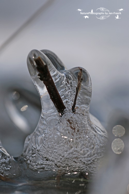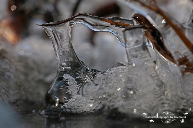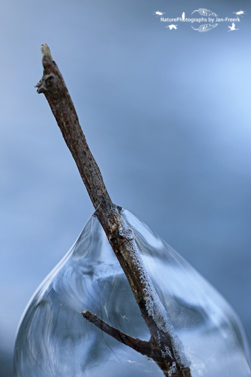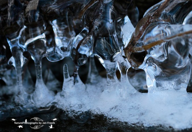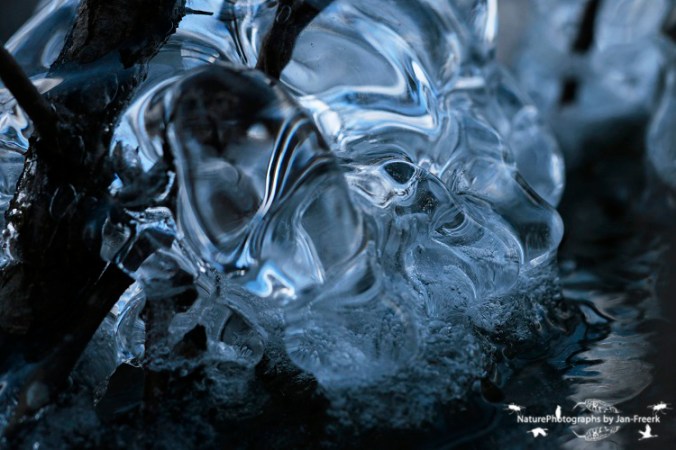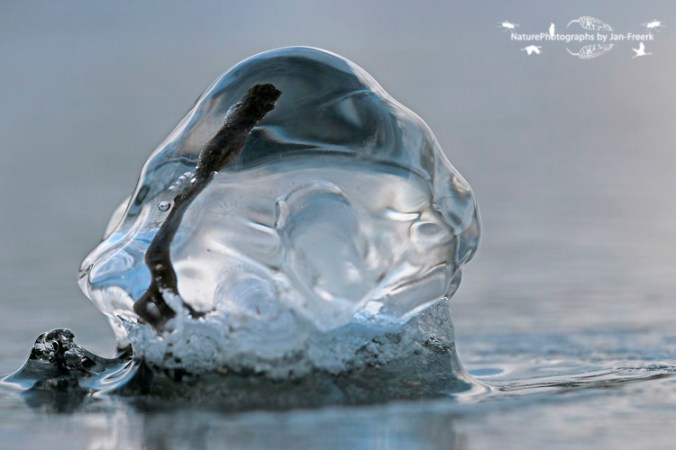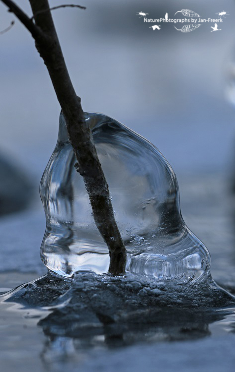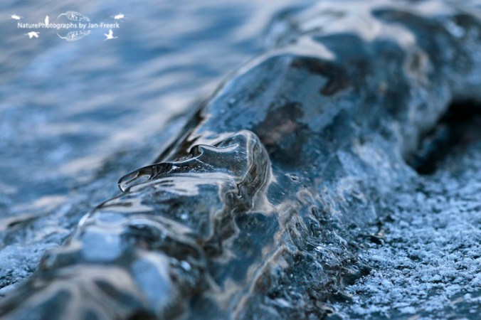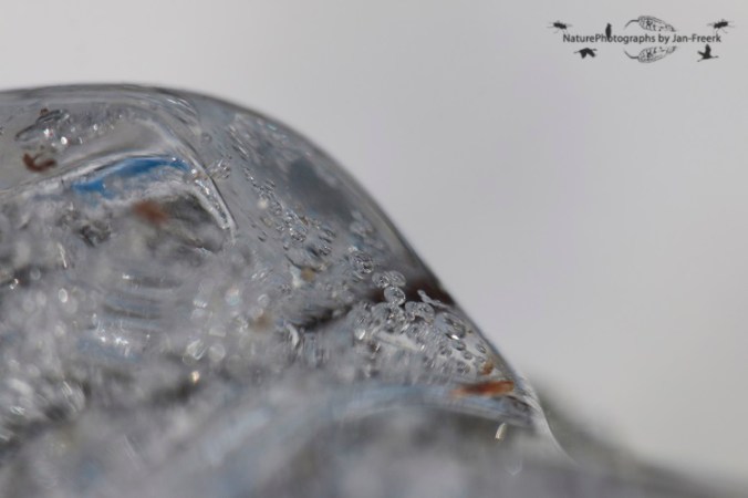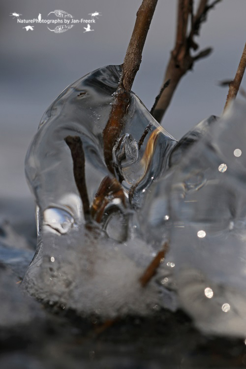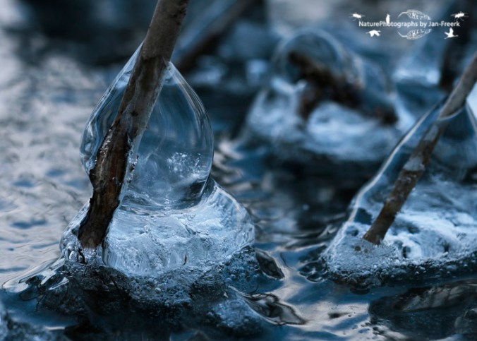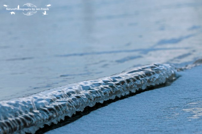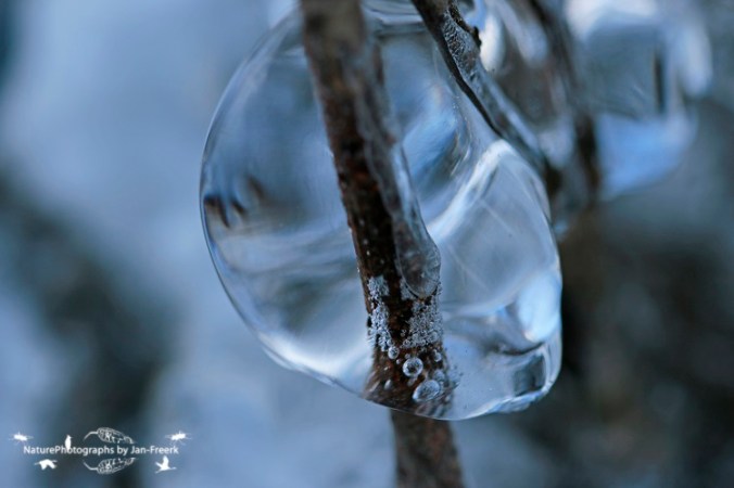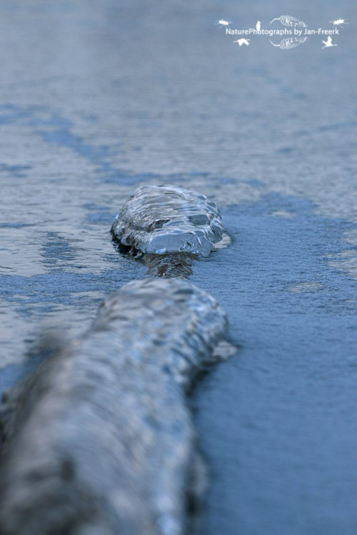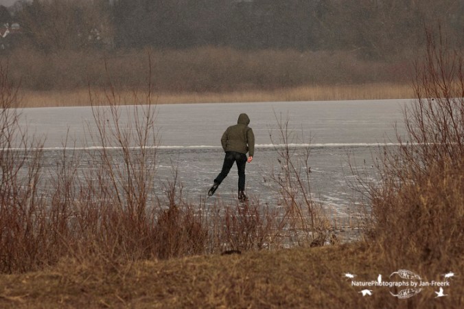 Na het schaatsen ging ik weer terug naar Wageningen, maar niet om stil te zitten. Ik ben vrij snel weer weggegaan om in de buurt naar potentieel schaatsijs te gaan zoeken en te kijken wat ik tegenkwam. Op de Nevengeul in de Wageningse Uiterwaarden waren enkele schaatsers die tussen de wakken door reden. Niet echt veilig dus. Dankzij de wind die de wakken open hield waren langs de kant ook ontzettend mooie vormen rondom takjes ontstaan. Het water is tegen de takjes aangeblazen en op die manier ontstonden ontzettend fotogenieke objecten. In de Blauwe Kamer werd ook geschaatst. Dat was redelijk veilig, maar er liep een richel midden over de plas waardoor het baantje niet erg groot was. Op de terugweg zag ik langs het Nieuwe Kanaal nog een slobeend (nog nooit gezien in die buurt) en meerdere ijsvogels.