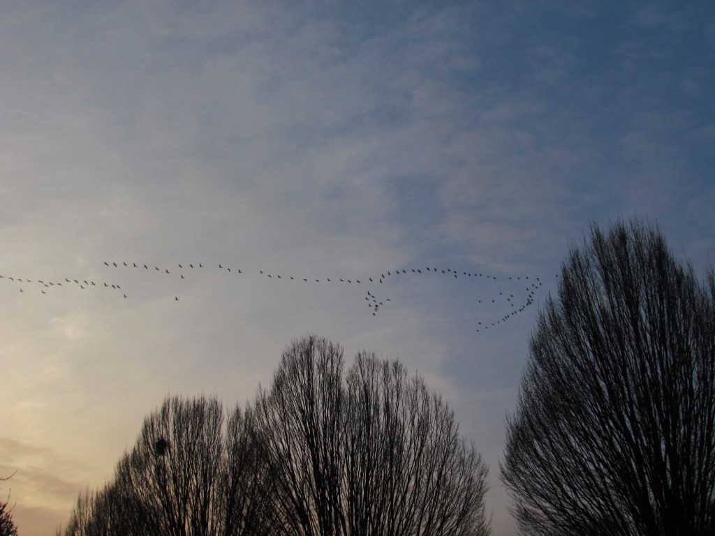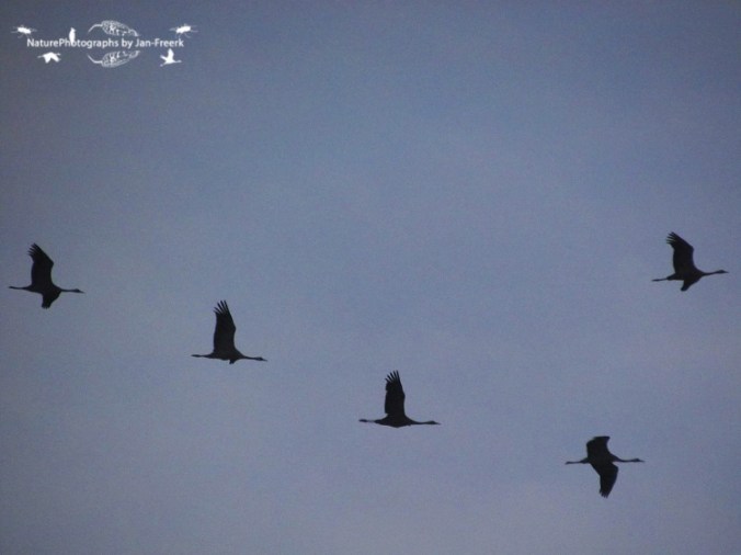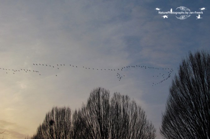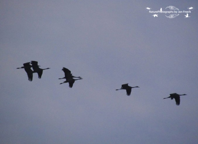 Gisteren werden we vlak voor het avondeten opgeschrikt door een berichtje in de Whatsappgroep voor zeldzaamheden rondom Wageningen. Bij de Blauwe Kamer vloog een grote groep kraanvogels over, recht op Wageningen af. Wij gingen eten, maar met een oogje op de zuidwestelijke hemel. Na iets minder dan 10 minuten riep mijn vader: “daar komen ze!” En ja hoor, daar kwam de enorme groep van maar liefst 119 kraanvogels overvliegen. Niet snel, tegen de wind in, tegen elkaar roepend kwam daar een prachtige sierlijke groep aan. Mijn camera zat nog onderin mijn tas, dus rende ik met tas en al naar buiten, zodat als ik mijn camera niet zou kunnen pakken ik ze in elk geval wel gezien zou hebben. Buiten hield ik mijn tas ondersteboven zodat alles op straat viel, inclusief mijn camera. Omdat ze zo langzaam vlogen was ik nog op tijd voor wat foto’s en een kort filmpje van de hele groep!