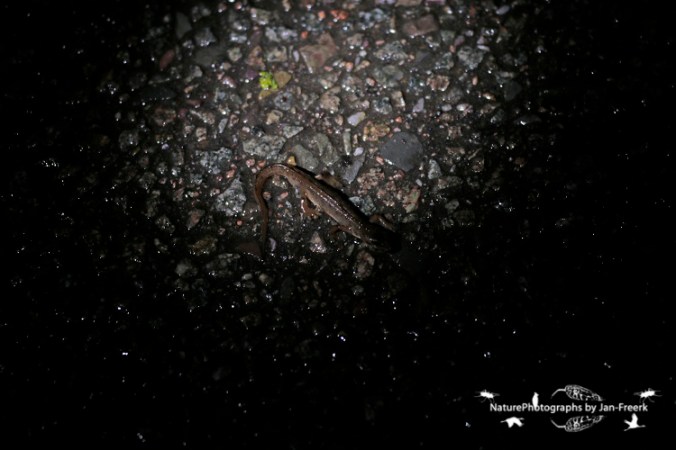 Een week achter de kraanvogels aan komen nu de amfibieën tevoorschijn! Gisteren ben ik voor het eerst salamanders van de weg gaan rapen in de regen, maar bij een graad of 12. Het was waarschijnlijk niet de eerste dag dat ze trokken, maar wel één van de eerste. Elk jaar lijken het er meer te worden. Op ons “vaste” fietspad van 1200 meter dwars door Noordwest (de Rijnsteeg) hebben we 79 kleine watersalamanders levend overgezet! Ons vorige record is van vorig jaar, toen was de piek 56 salamanders op één avond. Van 2016 heb ik geen aantallen die terug te vinden zijn, en in 2015 was de topdag 38. Waar deze explosieve stijging aan ligt dat weet ik niet. Kijken we nu beter? Zijn er inderdaad twee keer zoveel salamanders als drie jaar geleden? Ook maakt het natuurlijk uit onder welke weersomstandigheden je kijkt. Dat was in 2017 ongeveer gelijk, van 2015 weet ik het niet meer.