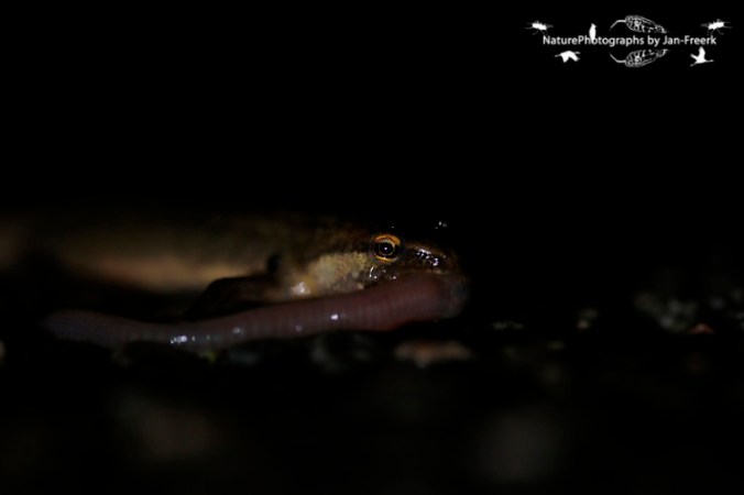 Kleine watersalamander, vrouw, met een regenworm als prooi. Eten is natuurlijk ook belangrijk onderweg!Bruine kikker