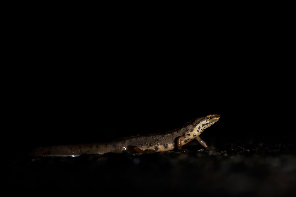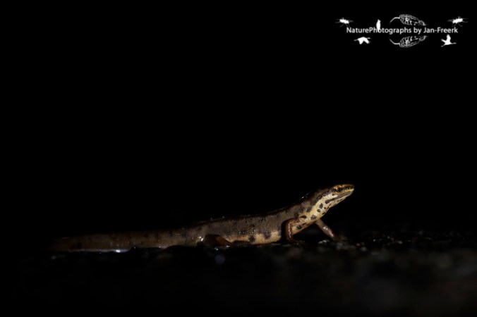 Gisteravond regende het. Ondanks de nattigheid waren er niet zo veel amfibieën op de been. Het was net wat aan de koude kant, en de grootste aantallen salamanders zijn waarschijnlijk al bij het water. Ondanks dat waren er nog 37 kleine 2 watersalamanders, 2 bruine kikkers en een gewone pad.