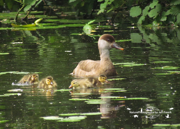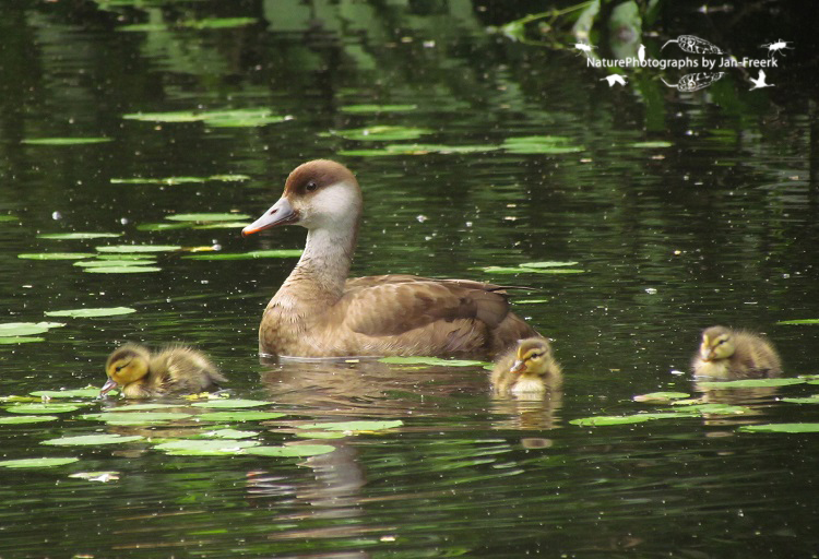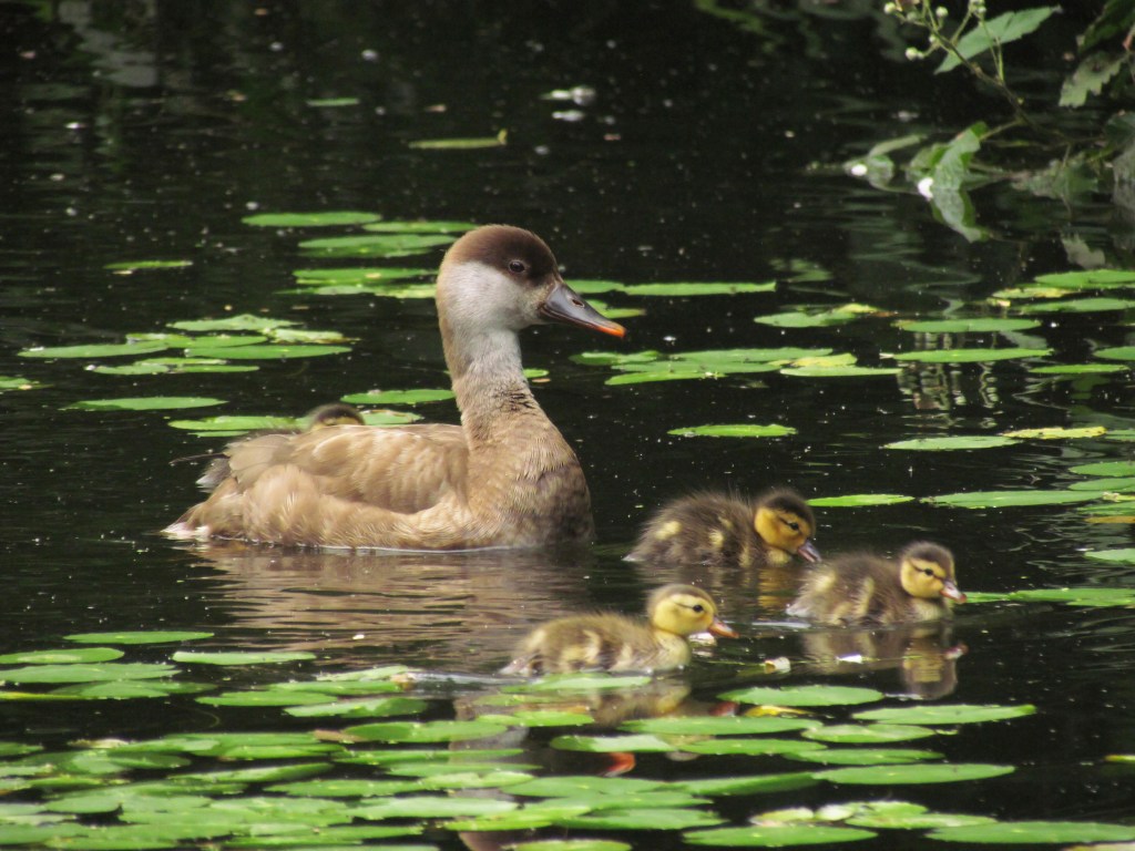 Vandaag ging ik even in het Noordwestpark van Wageningen kijken of er nog leuke libellen waren aan komen waaien. Stiekem hoopte ik natuurlijk op een sierlijke witsnuitlibel, maar die vond ik niet. Wel zag ik een vrouwtje krooneend, maar dit keer zelfs met vier jonge kuikentjes! Ik heb hier nog nooit een mannetje gezien, dus het is goed mogelijk dat de vader een wilde eend of kuifeend is. Ik ga ze in de gaten houden om te zien hoe de jongen eruit gaan zien.