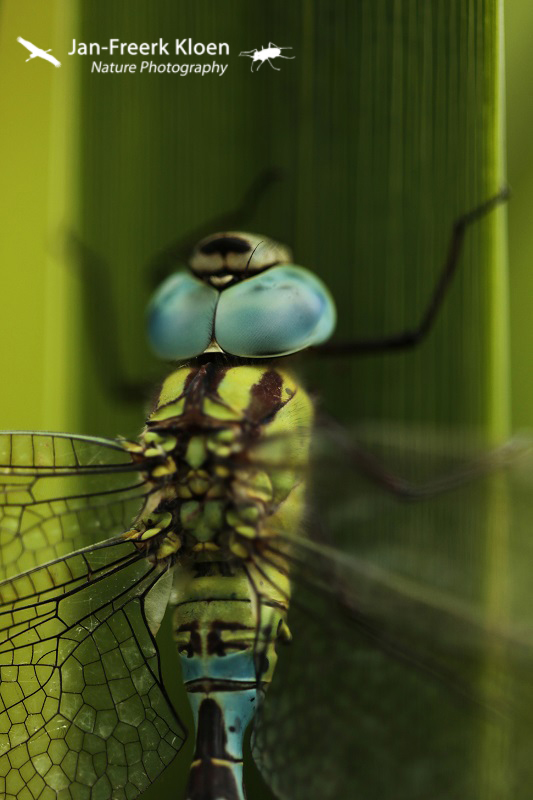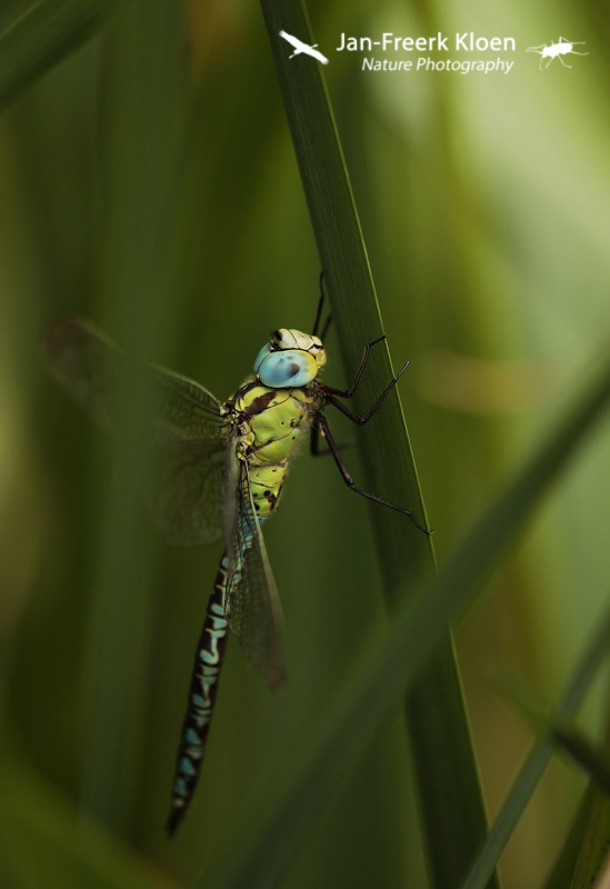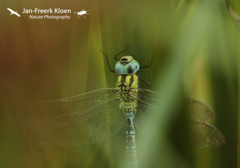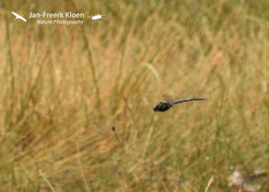 Qua weer was het nu helemaal dichtgetrokken, met een ferme wind erbij. Na heel goed zoeken met de verrekijker vond ik een larvehuidje in de stengels. Kort daarna dook er een vers mannetje de oeverbegroeiing in, die daarna ook goed terug te vinden was. Ook de foto’s wilden nog best lukken, ondanks dat het een onder-achter-tussen-geval was. Snel daarna vloog er nog een, een vrouwtje, die af en toe stopte om wat eitjes op de krabbenscheer af te zetten.