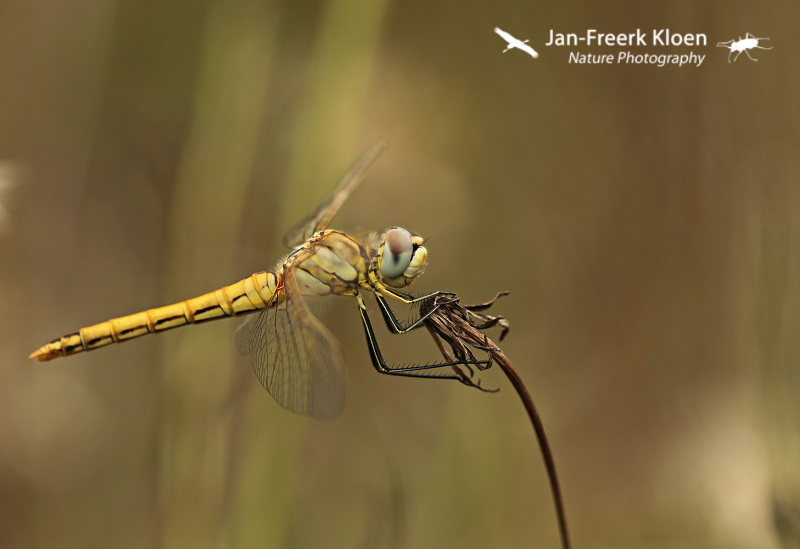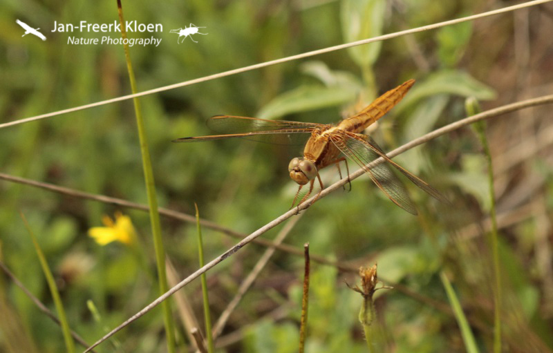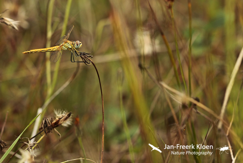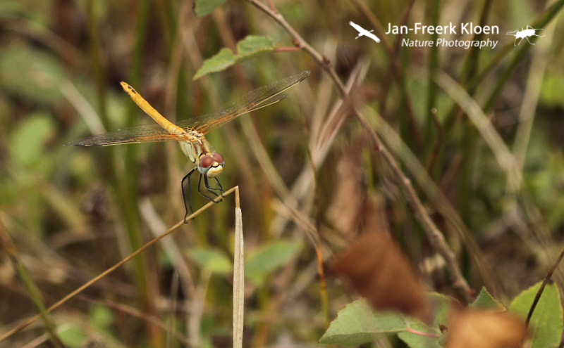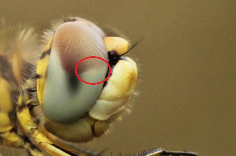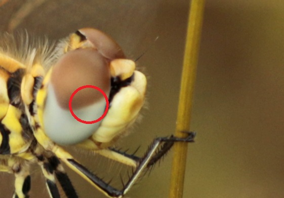 Ook vond ik een aantal zwervende heidelibellen. Eén niet uitgekleurd mannetje en twee ook nog vers ogende vrouwtjes. In het veld zag ik twee vrouwtjes vlakbij elkaar maar niet tegelijk. Naast mijn vermoeden bewezen de foto’s ook dat het twee verschillende waren door een bochtje dat eentje in de voorrand van de grens tussen rood het blauw in het oog heeft (rood omcirkeld in de close-ups).