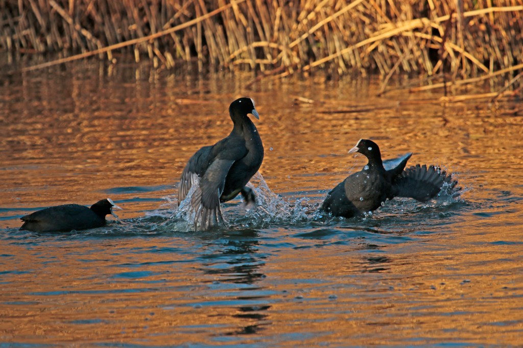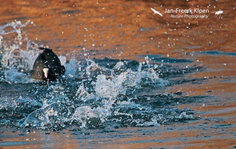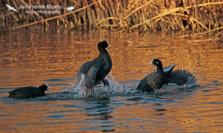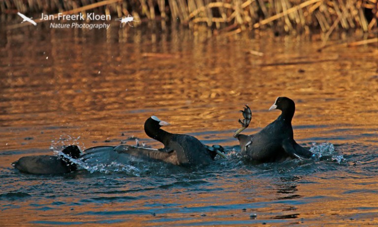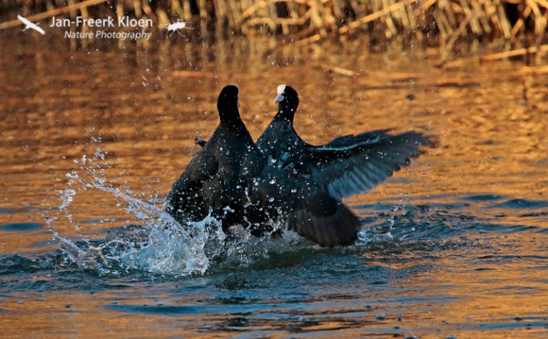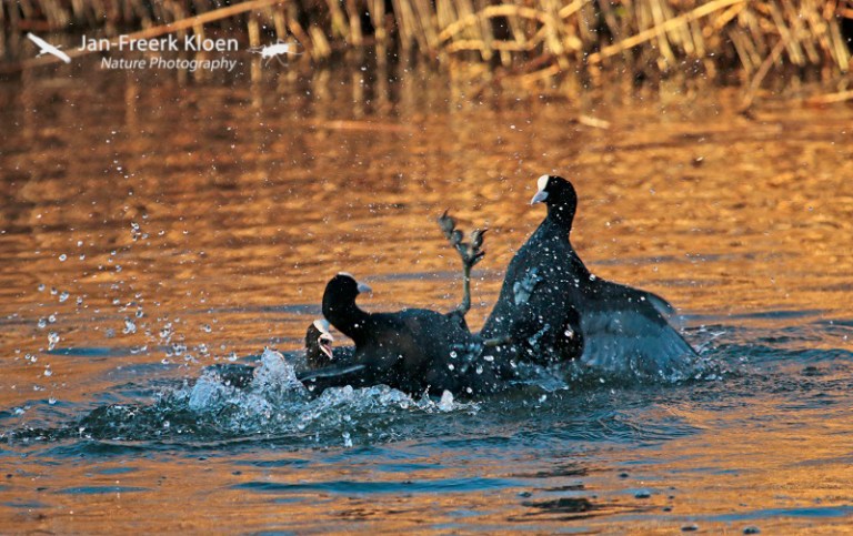 Vandaag ben ik bijna de hele dag onder de pannen geweest met buiten rondfietsen rondom Wageningen. Een heerlijke vrieslucht met een verwarmend zonnetje. Qua vogels was het verrassend mager, maar uiteindelijk heb ik bij de Grift toch nog wat leuke plaatjes kunnen schieten van stoeiende meerkoeten die elkaar aardig de tent uit joegen. Ik was daar eigenlijk in de hoop een roerdomp te betrappen die daar regelmatig te zien is als het vriest, maar dat is niet gelukt. Dan kun je nog zo prachtig avondlicht hebben, zonder roerdomp kun je dan moeilijk roerdompenplaatjes schieten…