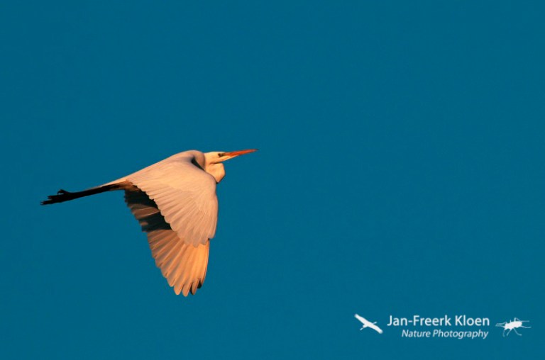 Overvliegende grote zilverreiger in de avondzon