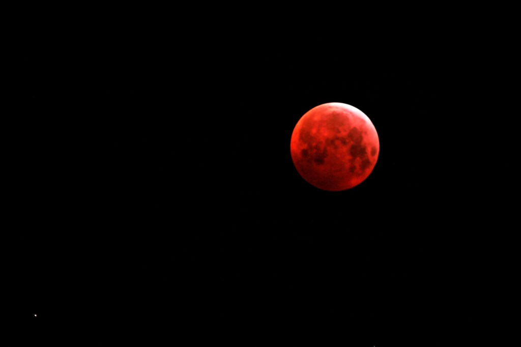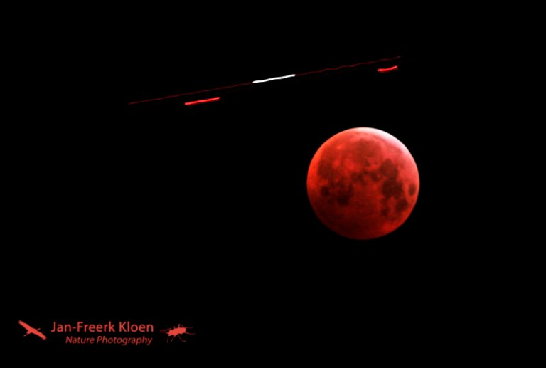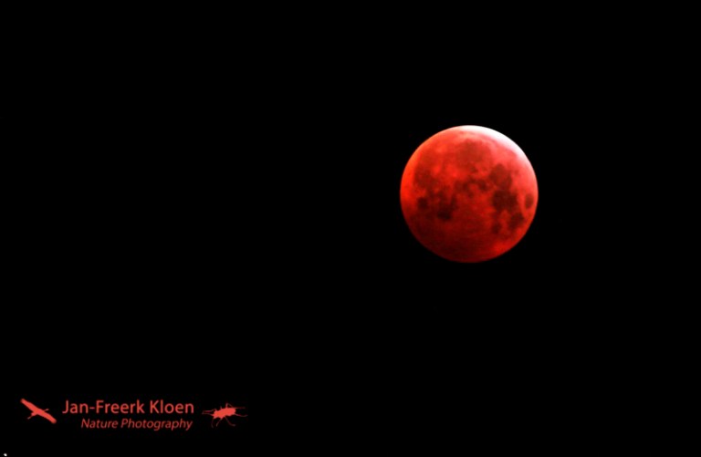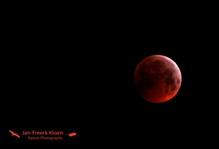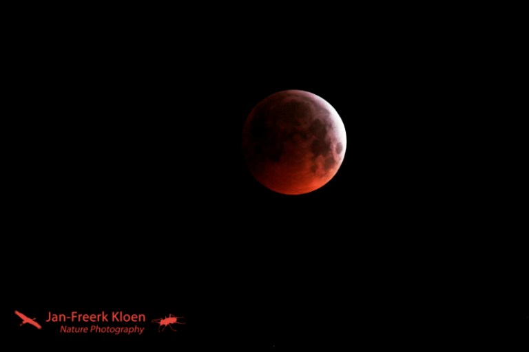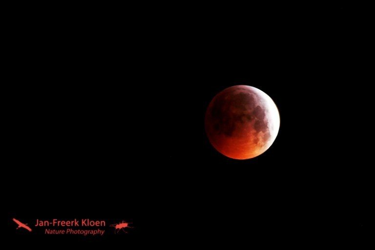 5:53 uur, de maan is volledig verduisterd, ook wel ‘bloedmaan’ genoemd. Door een aantal andere omstandigheden zelfs een ‘superbloedwolfmaan’. De volgende daarvan is pas in 2037.