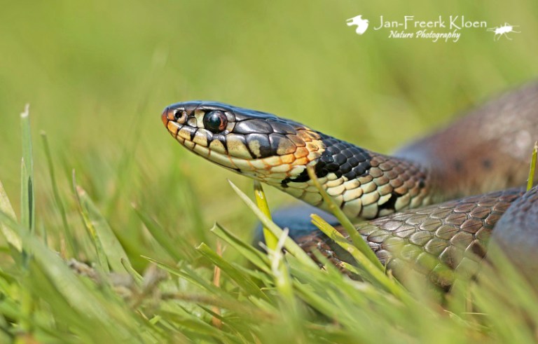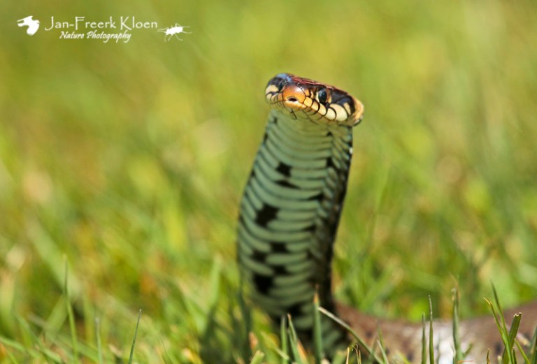 De gevlekte ringslang nam een cobrahouding aan, gedrag dat bij ringslangen zelden voorkomt