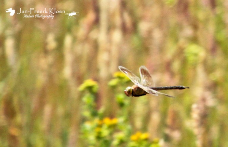 Reden genoeg om naar de grote plas te gaan. Ook hier was het al snel raak met een zadellibel, maar het bleef erg moeizaam. Mede door de wind vlogen ze snel en onrustig, waardoor foto’s maken erg lastig was. Ook was het aantal lang zo hoog niet als het een week geleden scheen te zijn. Behalve zadellibellen waren er onmogelijk veel zwervende heidelibellen en enkele zuidelijke keizerlibellen te zien.