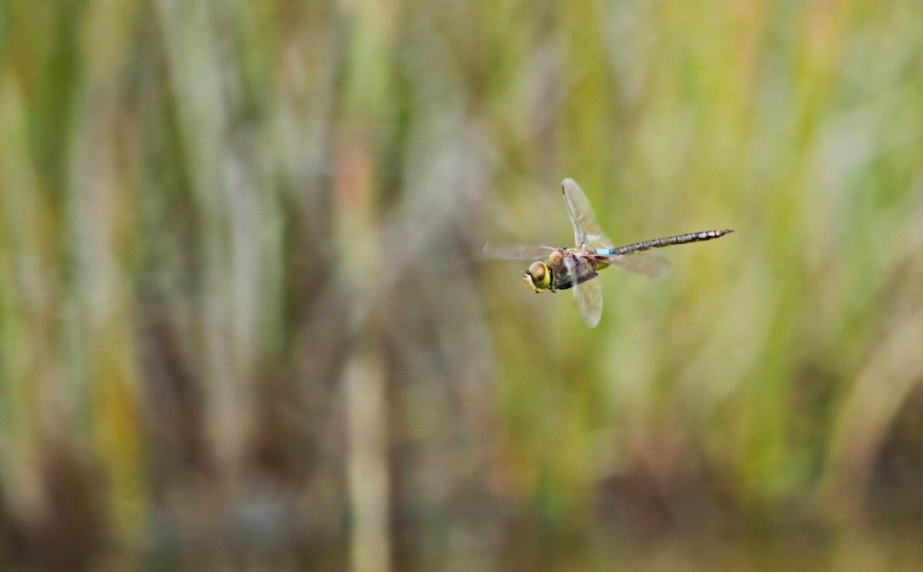 De zadellibel bij de Ringselvennen. Als je goed kijkt zie je zelfs op de vluchtfoto’s al een aantal libellenknutjes zitten!