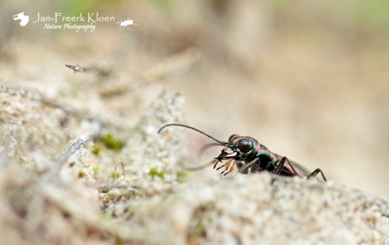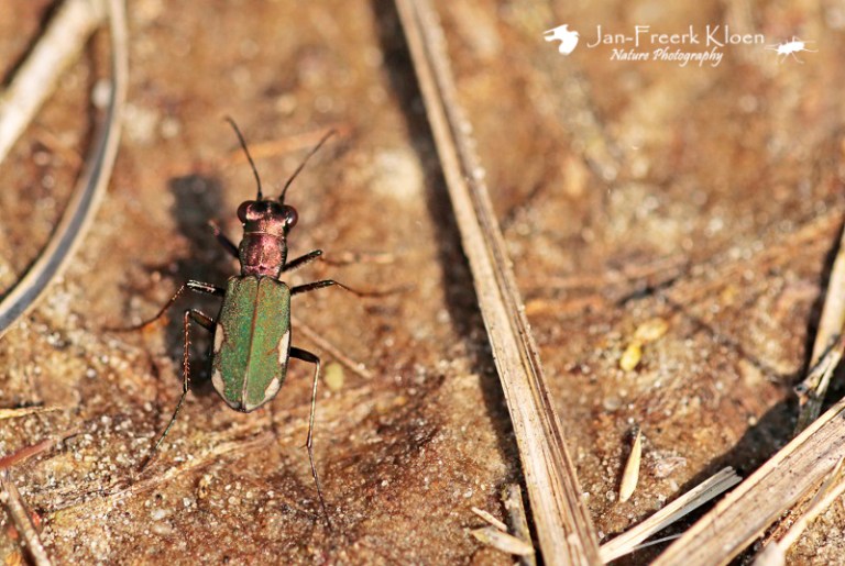 Tot slot liep ik nog een stukje door naar achter, waar ik wist dat er als één van de weinige plekken in Nederland een populatie Duitse zandloopkevers zit. Vorig jaar heb ik er met wat moeite drie kunnen vinden, in 2016 idem. Nu barstte het ervan. Het was een stuk natter nog dan de vorige keren, misschien dat ze dat chiller vinden. Maar ze schoten werkelijk overal rond. Zeker 32 stuks telde ik er, tegelijk met nog een zadellibel die van de plek wegvloog, een eileggend vrouwtje zuidelijke keizerlibel en een patrouillerend mannetje gevlekte glanslibel. Een prachtig einde van de dag die nog nét niet afgelopen was…