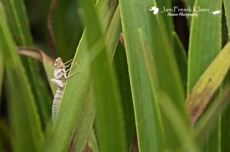 Larvenhuidje van een groene glazenmaker in de krabbenscheer
