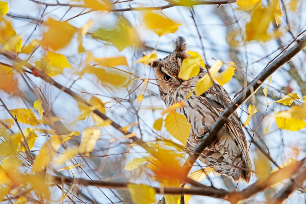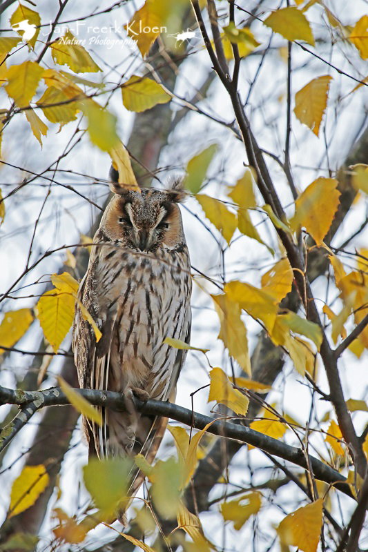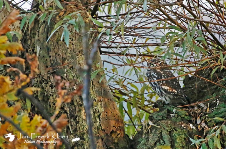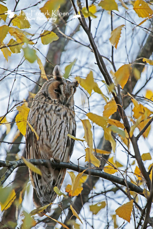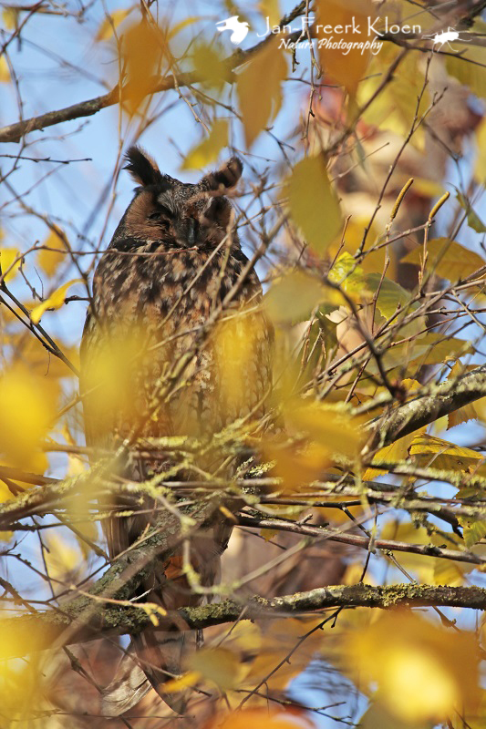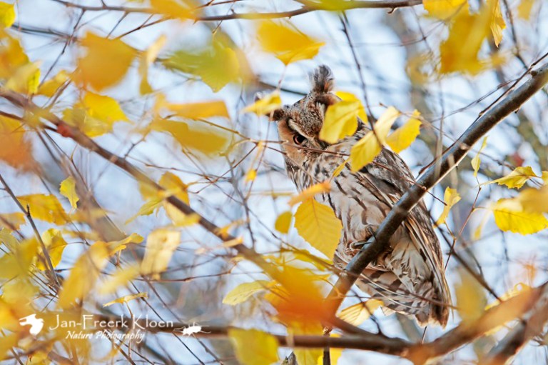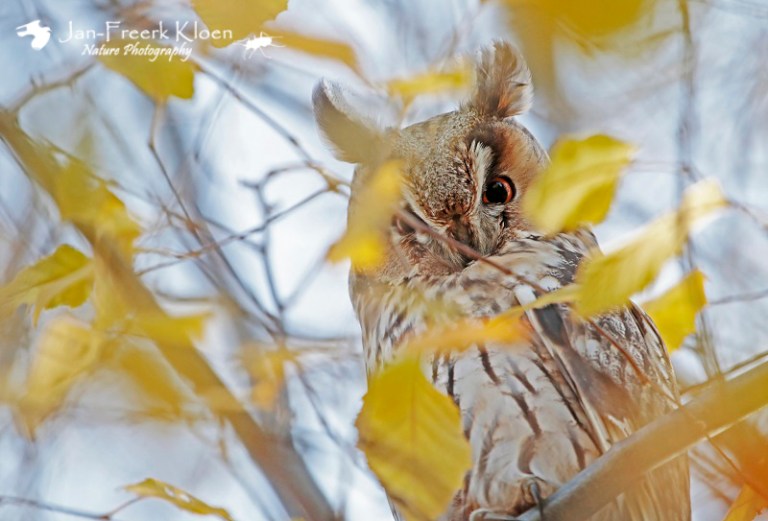 Vandaag ben ik weer in Wageningen en omgeving op pad geweest met mijn telelens. Het was prachtig weer en het licht was echt top voor foto’s! Eerst ging ik eens kijken of er weer ransuilen bij een bekende overwinteringsplaats zaten. Antwoord: ja! En beter nog: meestal zitten ze alleen in een dichte conifeer, maar deze keer zaten er ook twee in een berk. Er zaten nog redelijk wat gele blaadjes in, maar toch waren ze goed te zien! Bovendien leverden de gele blaadjes leuke herfstige en schilderachtige doorkijkjes op de uilen!