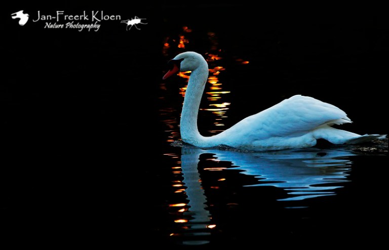 Knobbelzwaan voor de sfeerverlichting van de zonsondergang dwars door het Dassenbos