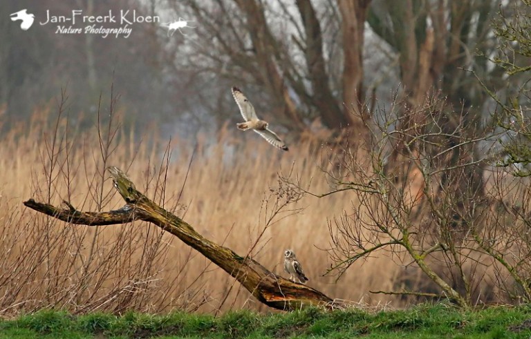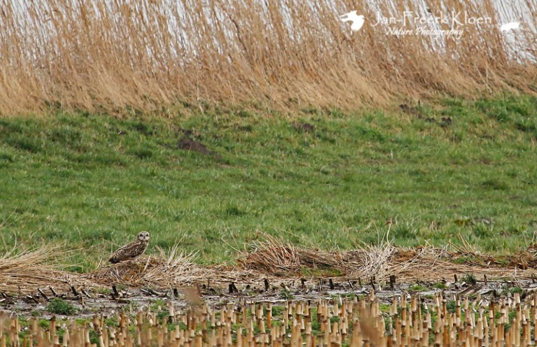 Vandaag ben ik met Corné en mijn vader op pad geweest. Om te beginnen naar de rand van het Eemmeer, waar veel velduilen schijnen te zitten. Er is ons geen woord teveel verteld. In totaal vlogen er minimaal een stuk of tien rond, ook veel boven het Eemmeer. Na een tijdje en wat ruzie met meeuwen kwamen ze weer richting de kant en streken neer op de rand van het meer, direct aan de waterkant. Hierdoor waren ze vanaf het land niet goed te zien, vanuit een boot waarschijnlijk wel. Die hadden we helaas niet en om te zwemmen was het wat te koud. Om daar in de polder in de wind stil te staan eigenlijk ook. Soms ver weg en soms dichtbij werd af en toe een mooie show weggegeven door de uilen.