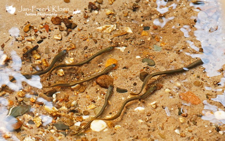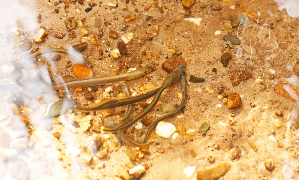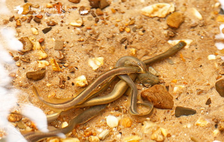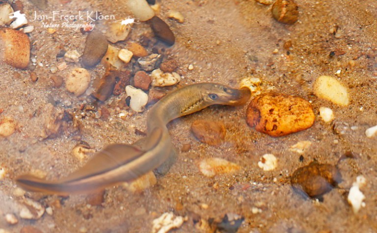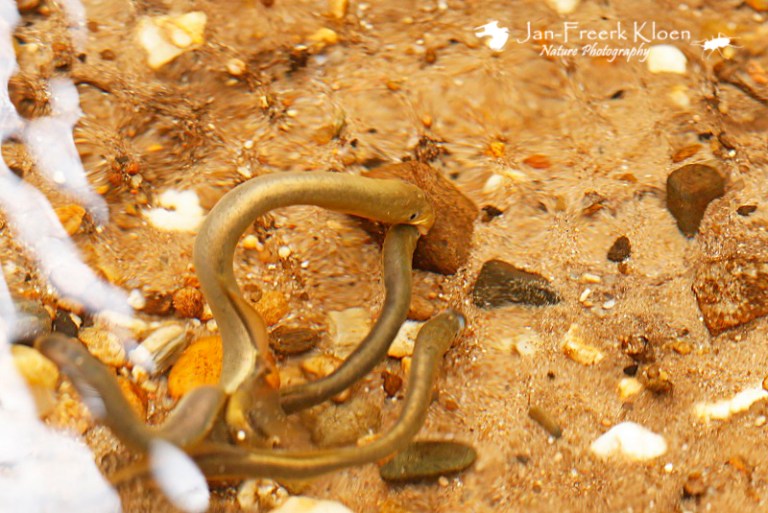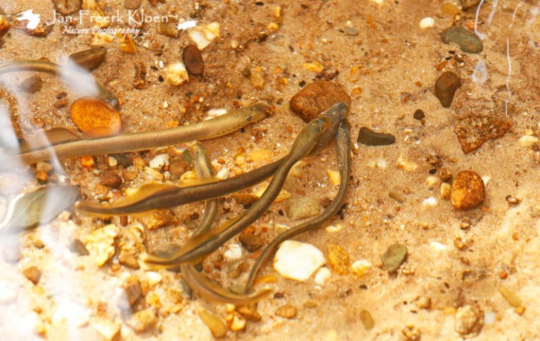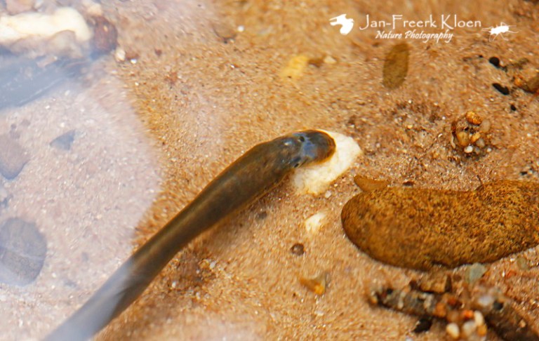 Een groepje paaiende beekprikkenGoed vasthouden met de zuigsnuit aan de kiezel om niet met de stroming af te drijvenDoor de rimpels in het water en het gebrek aan onderwaterapparatuur zitten er wat vervormingen in de meeste foto’s, zoals hier overduidelijk te zien is…