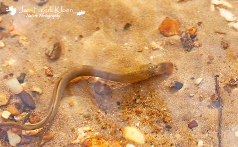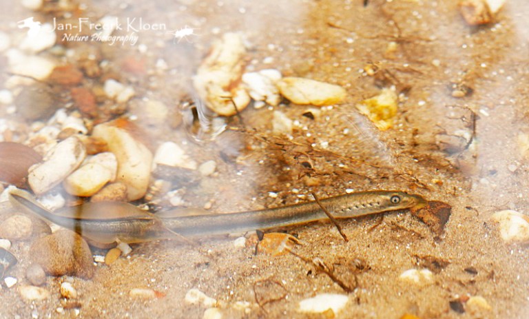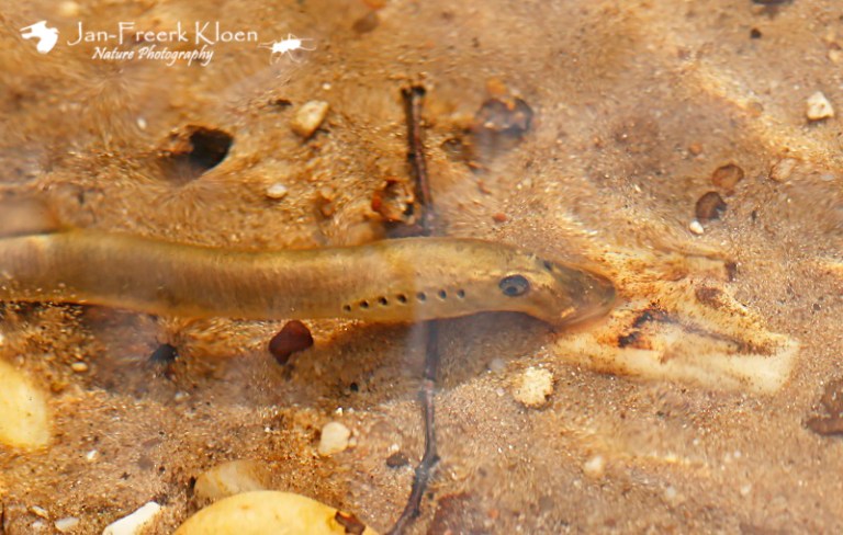 We zijn naar de Koppelsprengen bij Apeldoorn, een mooi complex van bronbeekjes midden op de Veluwe. Het doel was de beekprik, een zeldzaam visachtig dier dat niet echt een vis is maar er wel veel op lijkt. Een belangrijk verschil is het larvestadium van zo’n zeven jaar waarin de beekprik zonder ogen en karakteristieke zuigsnuit in de bodemlaag van de beek leeft. Daarna verandert hij tijdens een metamorfose in een visachtig dier, paart en sterft binnen een paar weken.