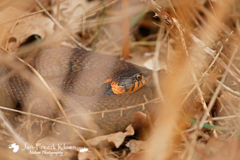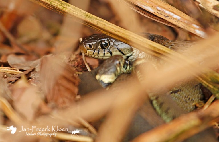 Vandaag heb ik voor RAVON een route gelopen onderlangs de Wageningse Berg. De score was geen slechte voor de eerste telling van het jaar: 18 gevlekte ringslangen, waarvan veel in paringskluwens. Ik was blij één van de vrouwtjes te zien: een opvallend exemplaar met een knaloranje ringvlek. Deze vond ik vorig jaar ook al, zo’n twintig meter van de plek waar ze nu lag. Leuk om haar weer terug te vinden!