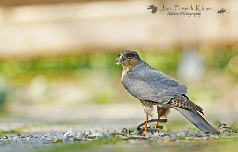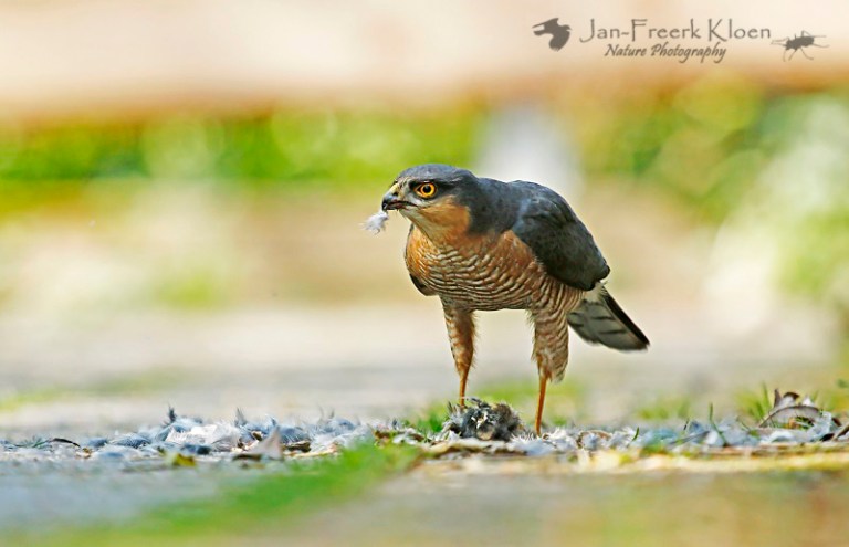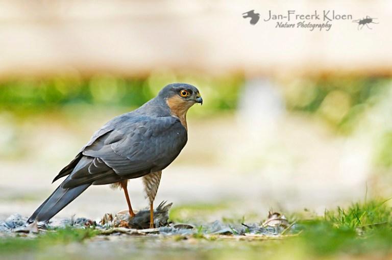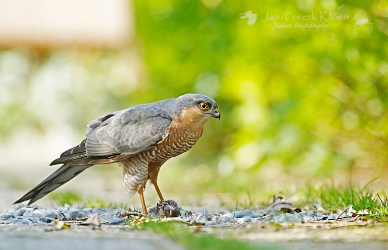 Na een portie online lessen via Microsoft Teams liep ik nietsvermoedend naar buiten tussen de middag. Ik liep de tuin uit, maar stopte gelijk. Ik zag een sperwerman op de stoep zitten, met een vers gevangen vogeltje. Zo rustig mogelijk deed ik een paar stappen achteruit de tuin in, om me vervolgens om te draaien en naar binnen te rennen en een camera te halen.