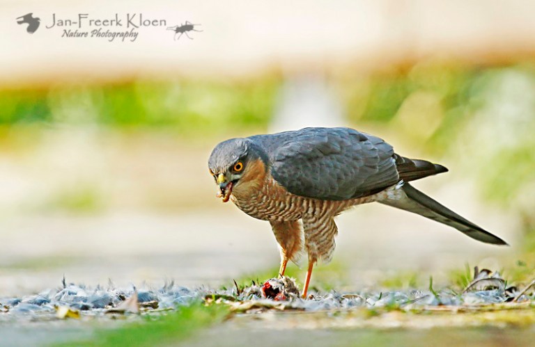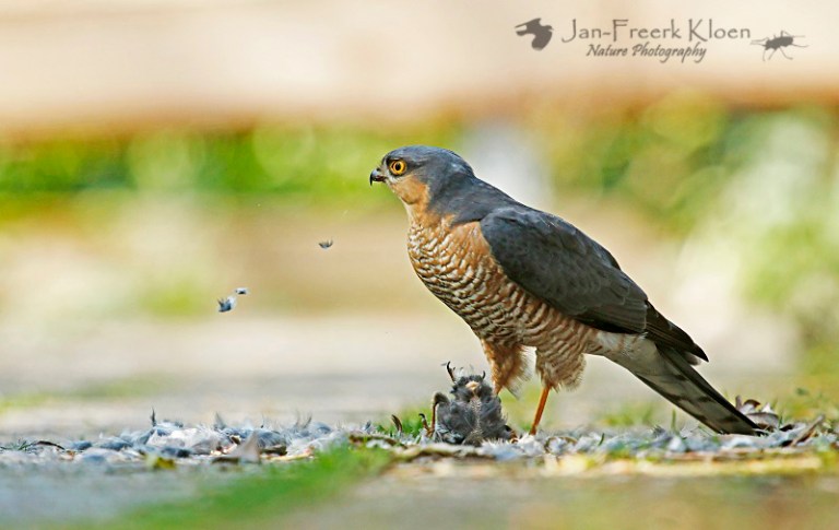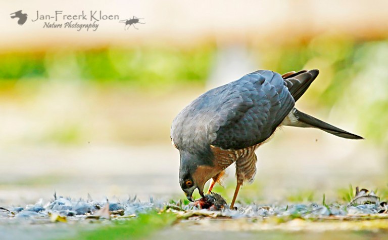 Nog een leuk feitje over etende sperwers rondom huis: bijna precies vijf jaar geleden zagen we voor het huis, ook vlak voor het eten een jonge sperwer met een huismus. Klik hier voor het blogbericht. Toevallig komt het nu allemaal bij elkaar uit met twee sperwers met dezelfde prooi met bijna precies twee jaar ertussen en twee sperwers met prooi in hetzelfde steegje.