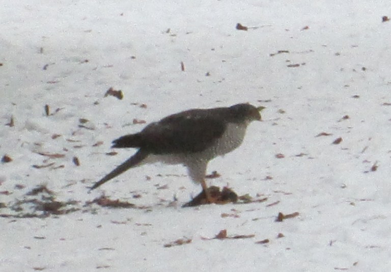 Overigens, terwijl ik dit schrijf bedenk ik me dat ik in hetzelfde steegje eerder een sperwer (toen een vrouw) met prooi heb gezien. Jaren geleden, in een winter met sneeuw. Het is zo lang geleden dat ik toen nog met een klein compactcameraatje liep. De foto’s vandaag zijn wel een upgrade. Zie hieronder een foto van bijna precies dezelfde plek, maar dan op 26 januari 2013.