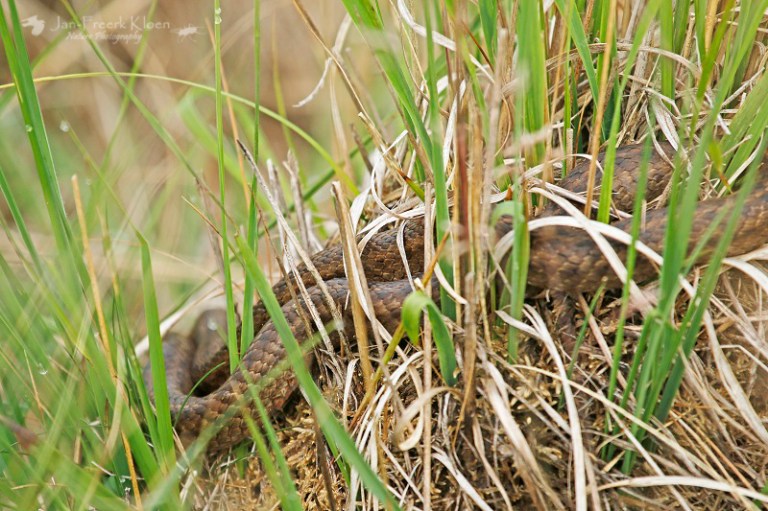 Een gladde slang (vrouwtje) goed verstopt in de begroeiing. Zoals je een gladde slang meestal aantreft.Maar soms laten ze zich ook heel fraai zien, zoals dit mannetje.