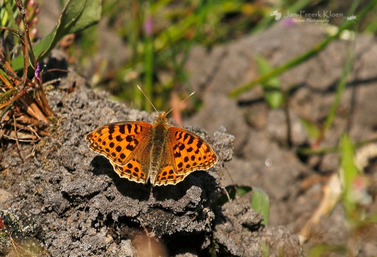 Kleine parelmoervlinderTijdens het libellenzoeken liet ik een jonge fazant schrikken. Hij schrok zó van mij dat hij niet meer wist of hij doodstil moest blijven zitten of weg moest vliegen, waardoor hij uiteindelijk allebei niet deed. Vertwijfeld bleef hij vlak voor mijn neus een beetje rondlopen. Na een foto heb ik hem met rust gelaten.