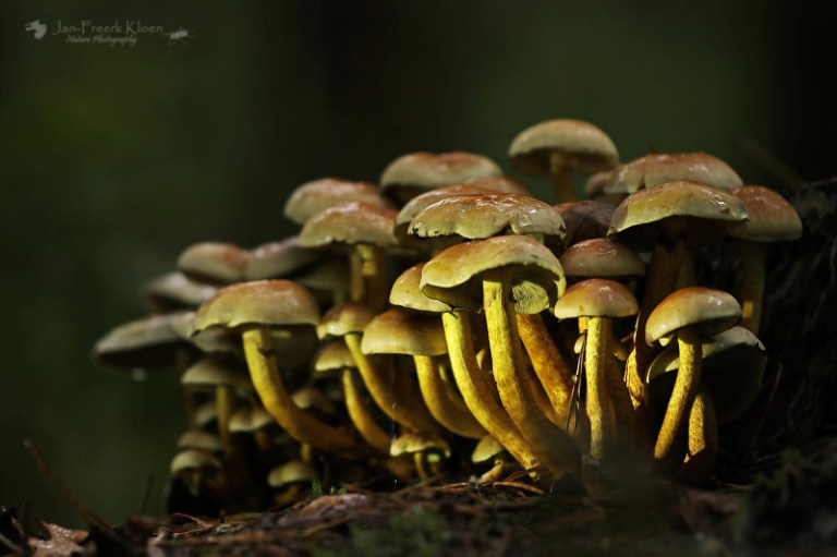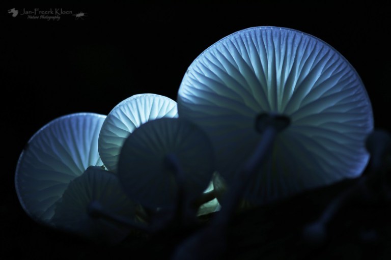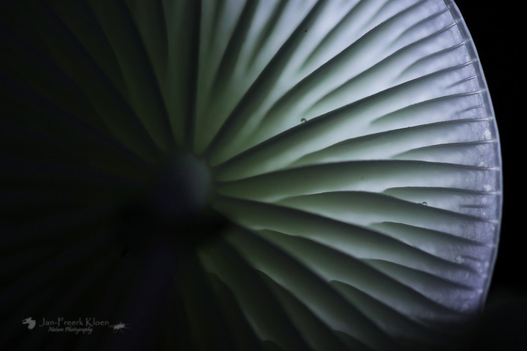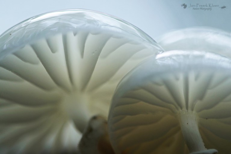 De wereld van de paddenstoelen heeft nog meer in petto. Prachtige grote, witte paddenstoelen, geven de de wereld weer een beetje licht. Als kleine lantaarns staan ze in al hun pracht op een al lang overleden stam. Zij stralen de laatste kracht van de ooit zo krachtige boom uit. Een prachtig gezicht.