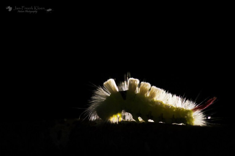 Deze stille woudreuzen zijn nog niet het meest bijzonder. Een klein, maar oh zo prachtig rupsje komt langswandelen. Felgroen, een lange, dichte vacht en een prachtige donkerrode stekel op het achterlijf. Klein, maar dapper en zeker wandelend door het wonderlandschap.