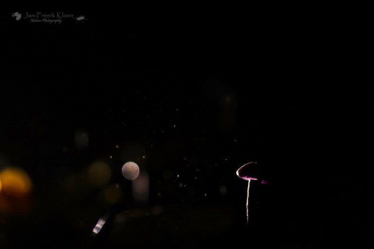 Ineengedoken, nog half in de sprookjeswereld, pak ik mijn camera in, volledig verscholen onder mijn grote paraplu, het lampje dat ik gebruikte voor de foto’s nog aan. Een auto stopt. Een vriendelijke, maar bezorgde man stapt uit en roept naar de opvallende, witte paraplu. Ik kijk eromheen en zie hem staan. Of alles wel goed met mij gaat. Ik moet lachen, maar bedank hem voor zijn bezorgdheid. Want wie is er niet verbaasd als hij in de stromende regen, in een donker bos een paraplu en een lichtje op de grond ziet liggen?
