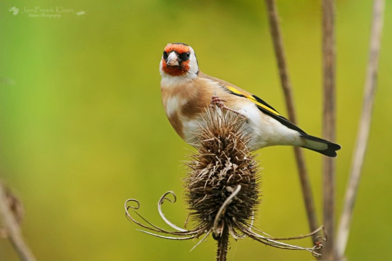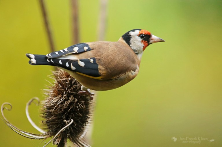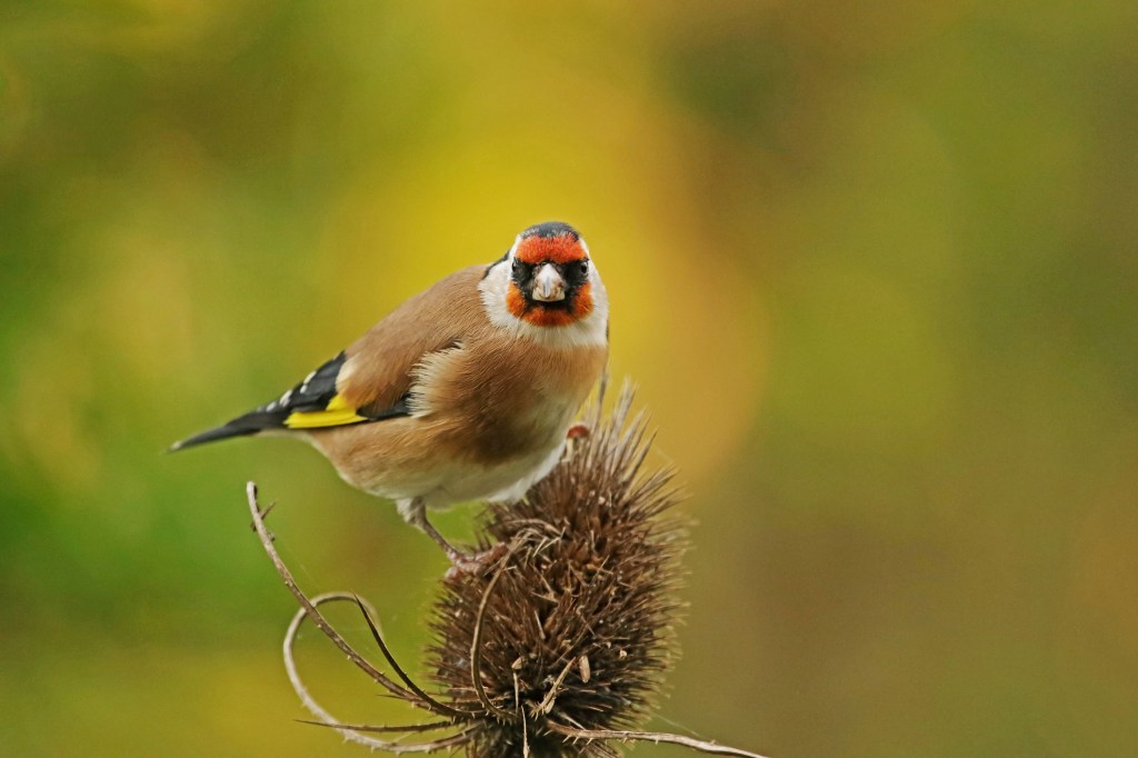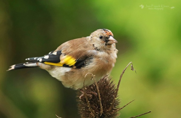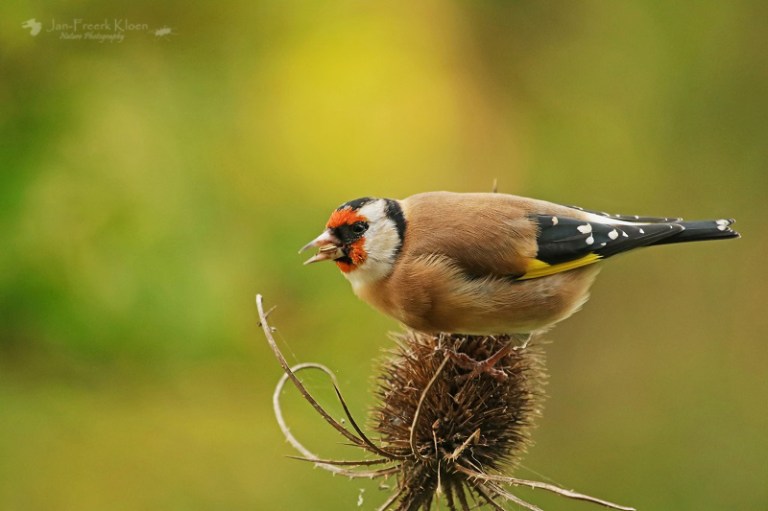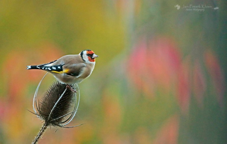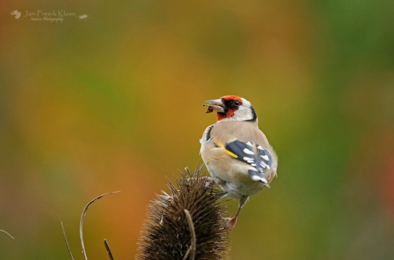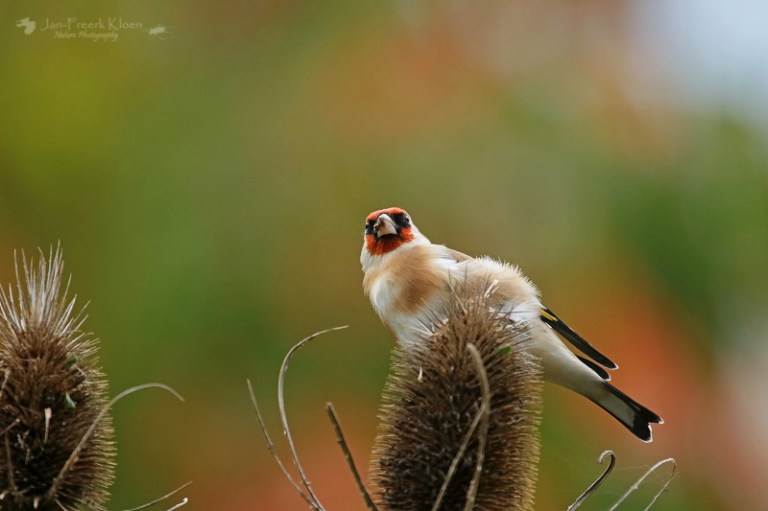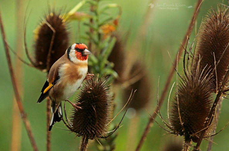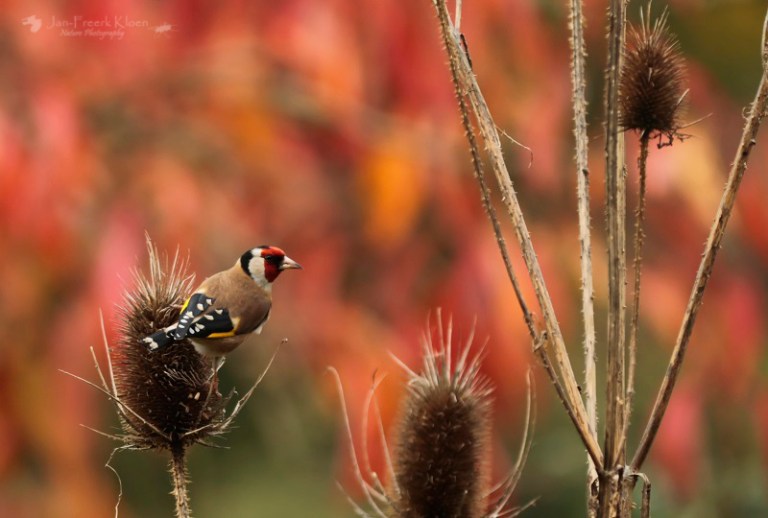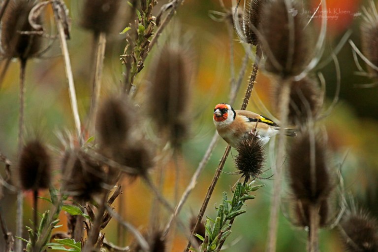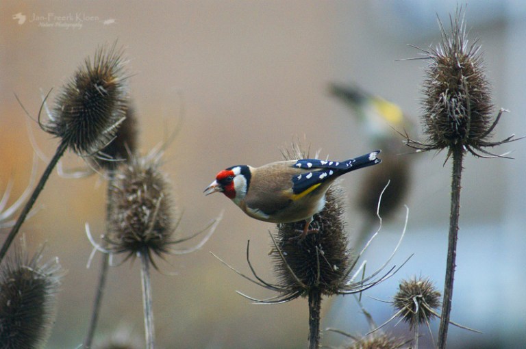 Nog steeds nemen de kaardenbollen in aantal toe. De voortuin staat al aardig vol. Een treurige, sombere aanblik, tot er een putter op gaat zitten. Dan verandert de grauwe, stekelige bol in een dansende egel met een vrolijk vogeltje erop. Balancerend zitten de putters soms wel een half uur lang in kleine groepjes te genieten. Meestal zijn het er één of twee, maar een enkele keer bestaan de groepjes in onze tuin uit vijf tot tien beestjes. Met meerdere dieren en tal van kaardenbollen op verschillende plekken in de tuin is de keuze voor mij als fotograaf dan ook reuze.