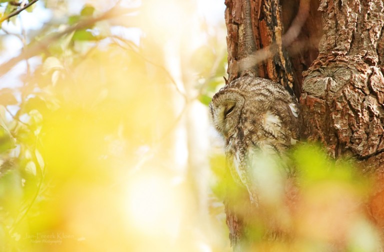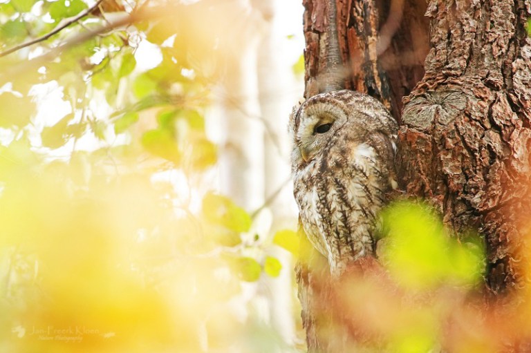 Op de bekende plek zat vriend bosuil trouw als altijd knikkebollend te wachten. Ik had hem al eens in de winter een bezoek gebracht, maar in de herfst is mooier. De herfstblaadjes voor en achter het gat in de els creëren een prachtige, pastelachtige omgeving. Om in te lijsten.