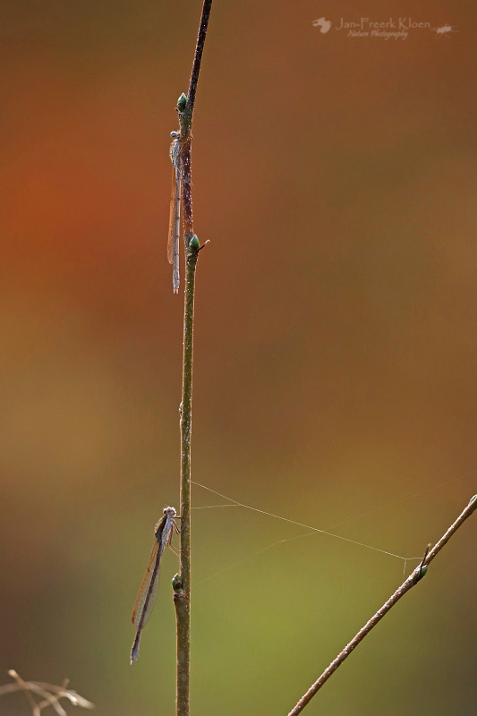 Niet alleen het Beekdal had mooie dingen te bieden. Langs een fietspad door het bos in de buurt gingen we nog even op zoek naar aardsterren omdat ik een idee in mijn hoofd had voor foto’s. Mijn vader had ze daar een paar weken eerder gezien, nu konden we ze niet vinden. In plaats daarvan ontdekte ik een heel aantal bruine winterjuffers, de enige libellensoort (samen met de noordse winterjuffer) die de winter als volwassen libel overleeft. Alle andere soorten leven als larve onder water tot het weer warmer wordt.