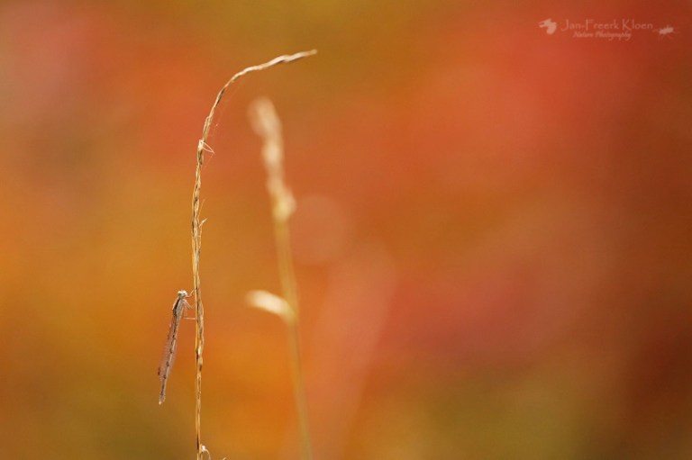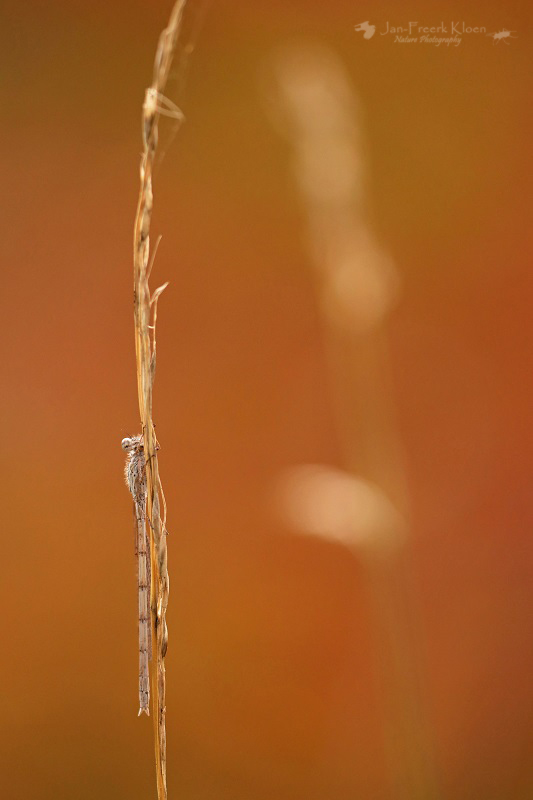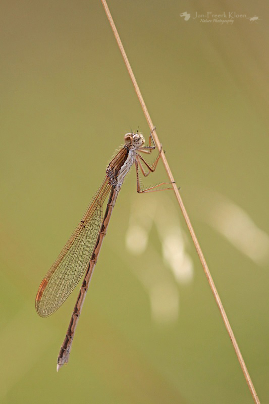 Een bijnaam van de winterjuffer is ‘vliegend strootje’. Slechts iets donkerder gekleurd, maar op afstand inderdaad niet heel veel meer dan een strootje. Van dichtbij mooi gedetailleerd getekend.