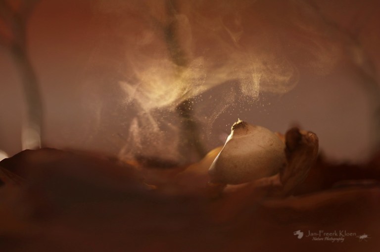 De aardsterren verspreiden hun sporen, waarmee ze hun soort vermenigvuldigen, via de lucht. In de bol zit een soort poeder dat rondstuift zodra er bijvoorbeeld een eikel of een grote regendruppel op valt. Een spectaculair gezicht voor de foto. Voor de paddenstoelen zelf kan het geen kwaad om ze voor de foto te laten ‘poefen’. Weliswaar wordt de paddenstoel in kwestie er niet fraaier op, de sporen verspreiden zich wel vanuit de wolk naar andere plekken. Hier kunnen dan weer nieuwe paddenstoelen uit de grond omhoog komen.