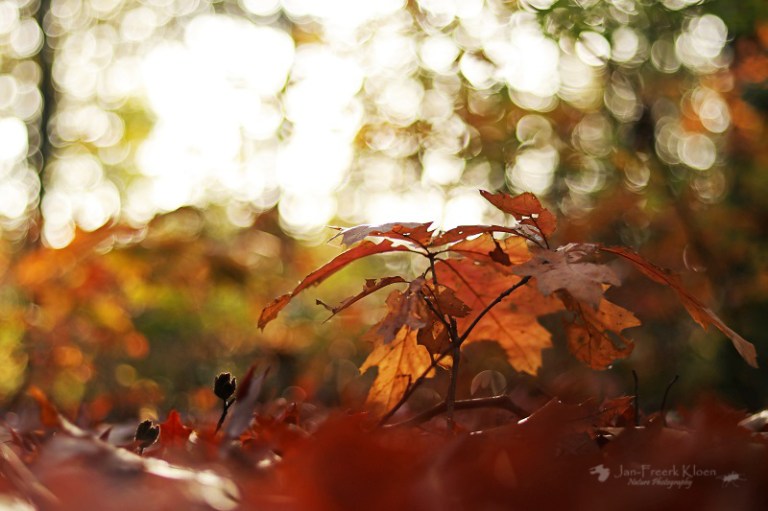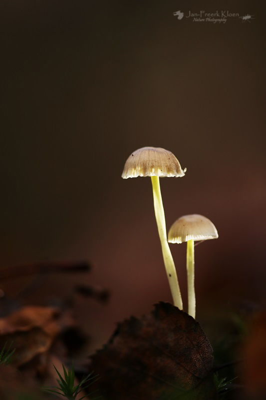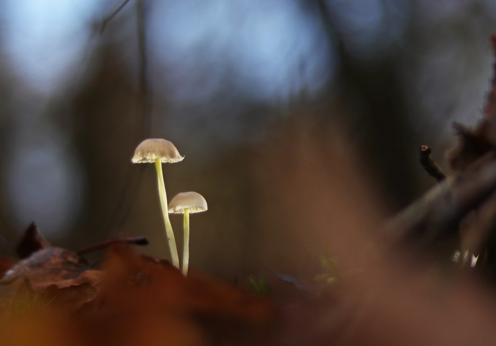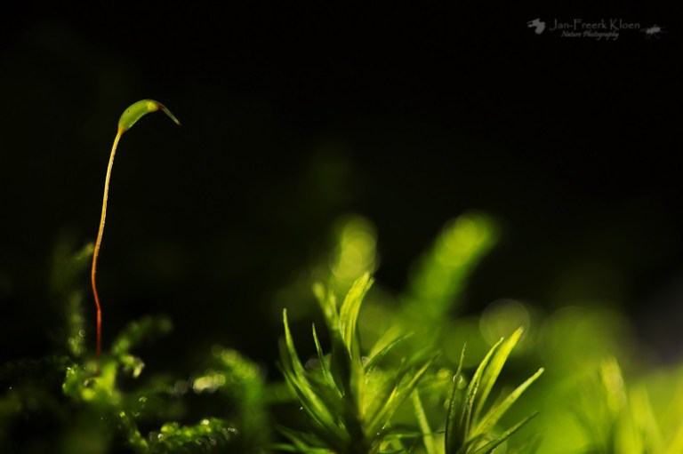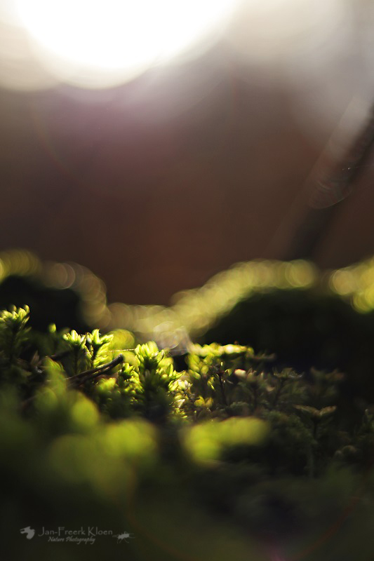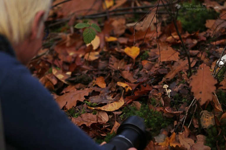 Het hoogtepunt van de dag was het fotograferen met een lampje. Ik liet zien wat een ringflitser voor effect heeft op de foto, en vooral wat een simpel zaklampje allemaal teweegbrengt. Je kunt er prachtig tegenlicht mee creëren op een klein voorwerp, of een deel van de foto uit de achtergrond tillen. Dit hebben we in eerste instantie op een half doorschijnend wit paddenstoeltje geprobeerd en daarna op mossen. Ook de zon zorgde af en toe voor mooie effecten op de mossen en varens.