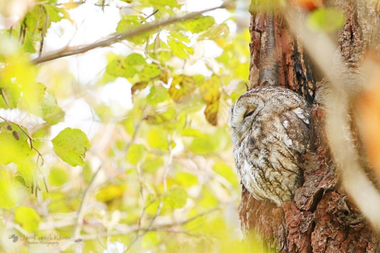 Zo ontdekten we wat de verschillende sluitertijden, diafragma’s, ISO-waarden en witbalans met een foto deden. Intussen was het Beekdal decor, met mossen, varens, paddenstoelen, herfstblaadjes en natuurlijk de oude bekende bosuil. Als kers op de taart, al was die iets te ver weg voor de lens van Paul, zagen we een middelste bonte specht door de bomen wandelen.