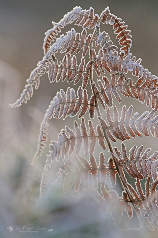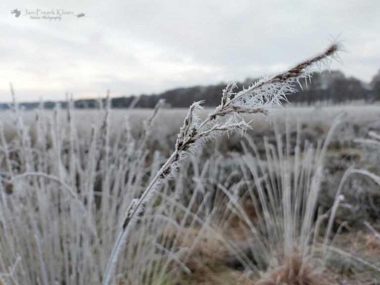 Het landschap is adembenemend mooi. Grote stekels van rijp zitten aan elk grassprietje en heidetakje. Alsof ze zichzelf hadden willen beschermen tegen de kou. Ik kan alleen maar genieten van de winterse aanblik.