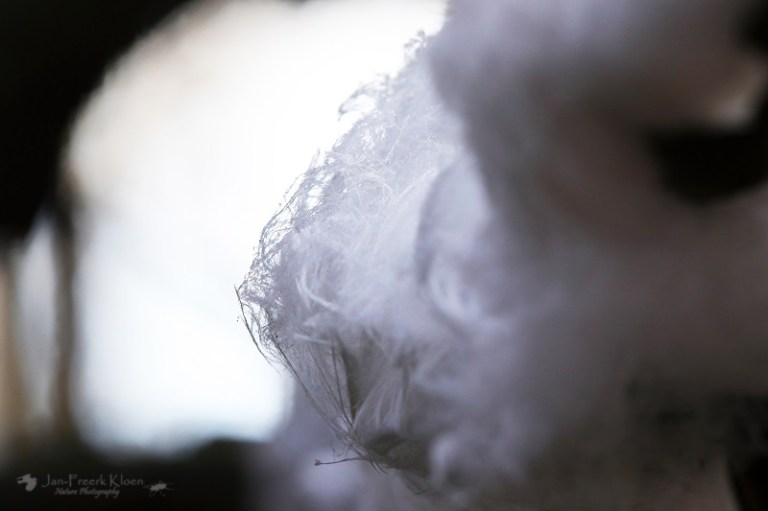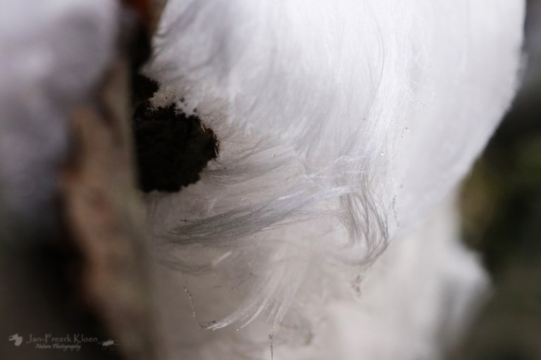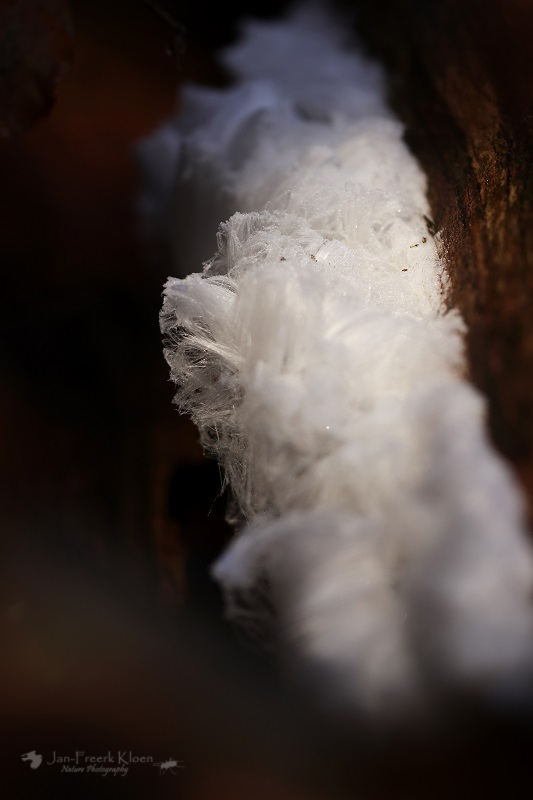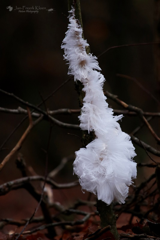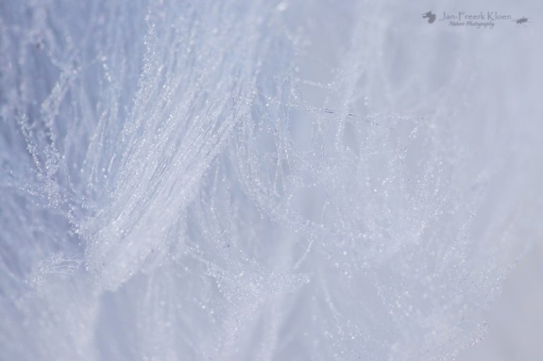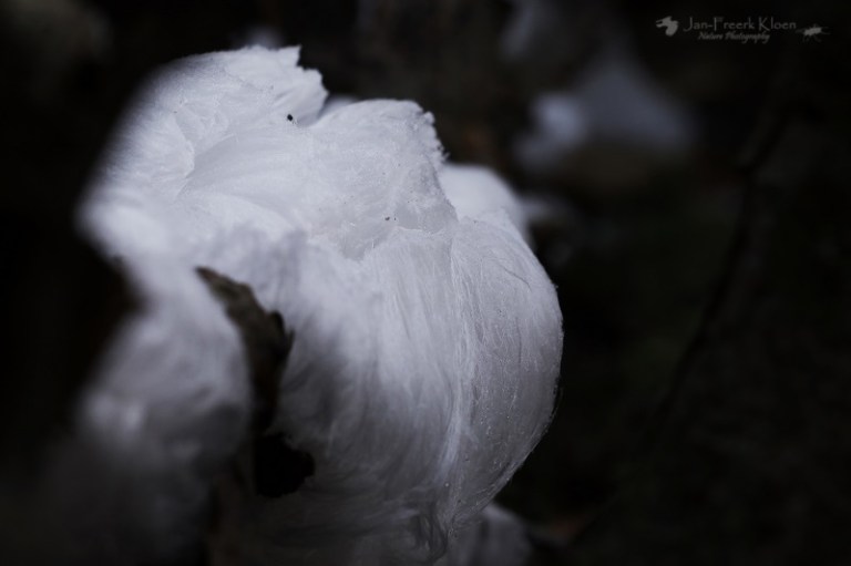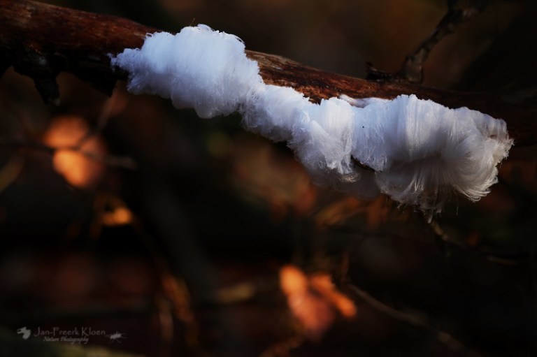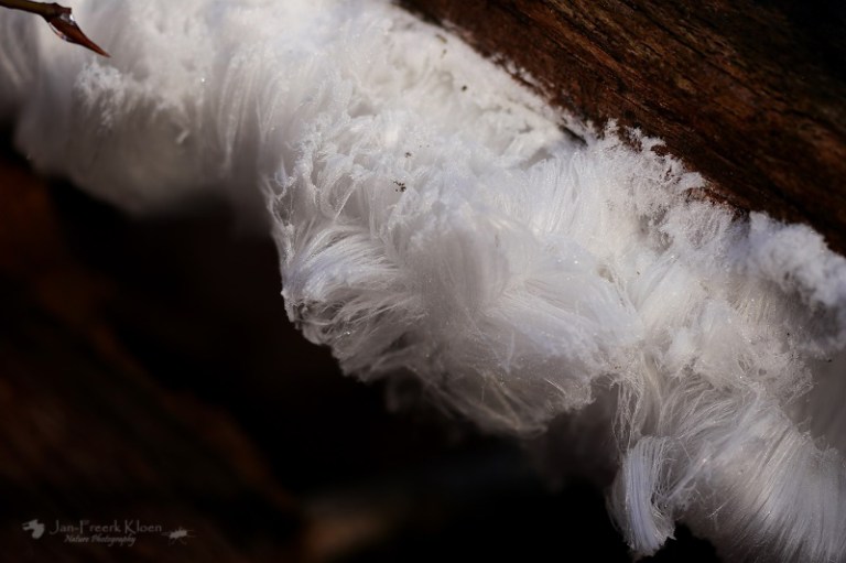 Een andere fotograaf met fiets bij het uitkijkpunt vertelt intussen dat hij een paar kilometer verderop in het bos ijshaar had gezien. En niet zo’n beetje, maar heel veel. Het is te ver lopen vanaf hier, maar in de wetenschap dat de omstandigheden blijkbaar geschikt zijn voor dit zeldzame fenomeen, letten we extra goed op. Als er plotseling ook nog regen valt en niet veel later de zon de wereld flink doet dampen en opwarmen geven we de hoop op. De meeste rijp is al gesmolten en het voelt al aardig wat warmer aan. Voor ons geen ijshaar vandaag.